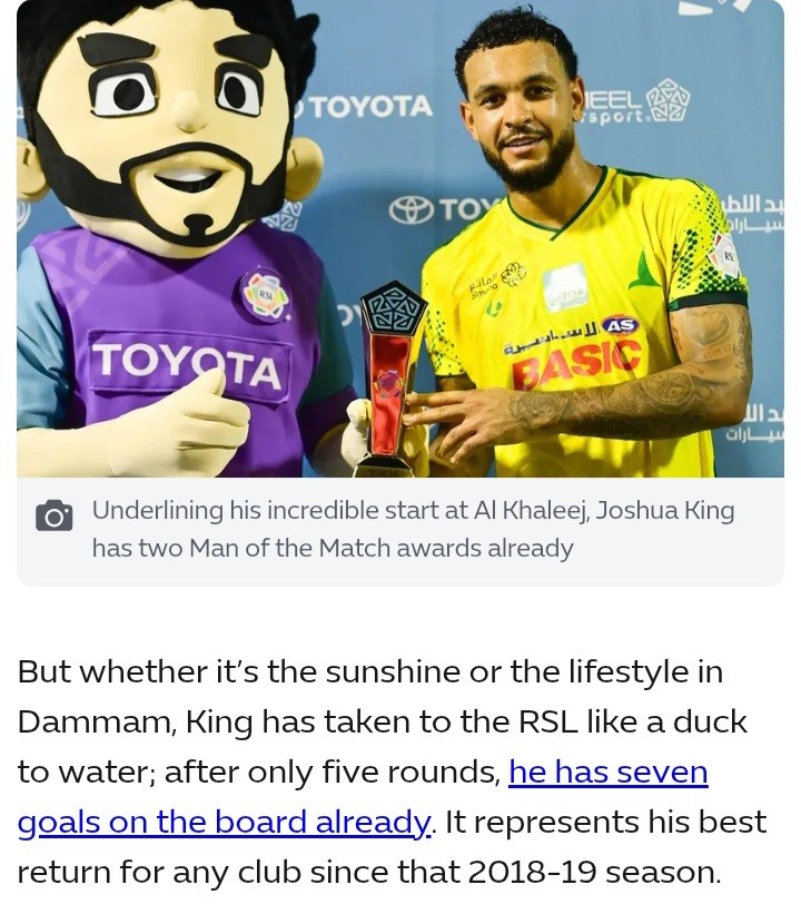 Odlican Start a Arapskoj ligi ima Joshua Jojo King koji na 7 utakmica ima 9 golova. Proslo kolo 2 pa je imao Hattrick protiv Riyadha. Eh sad hocel opet se upisat u strijelca mozda bas...Al Khaleej 15:55 🇸🇦