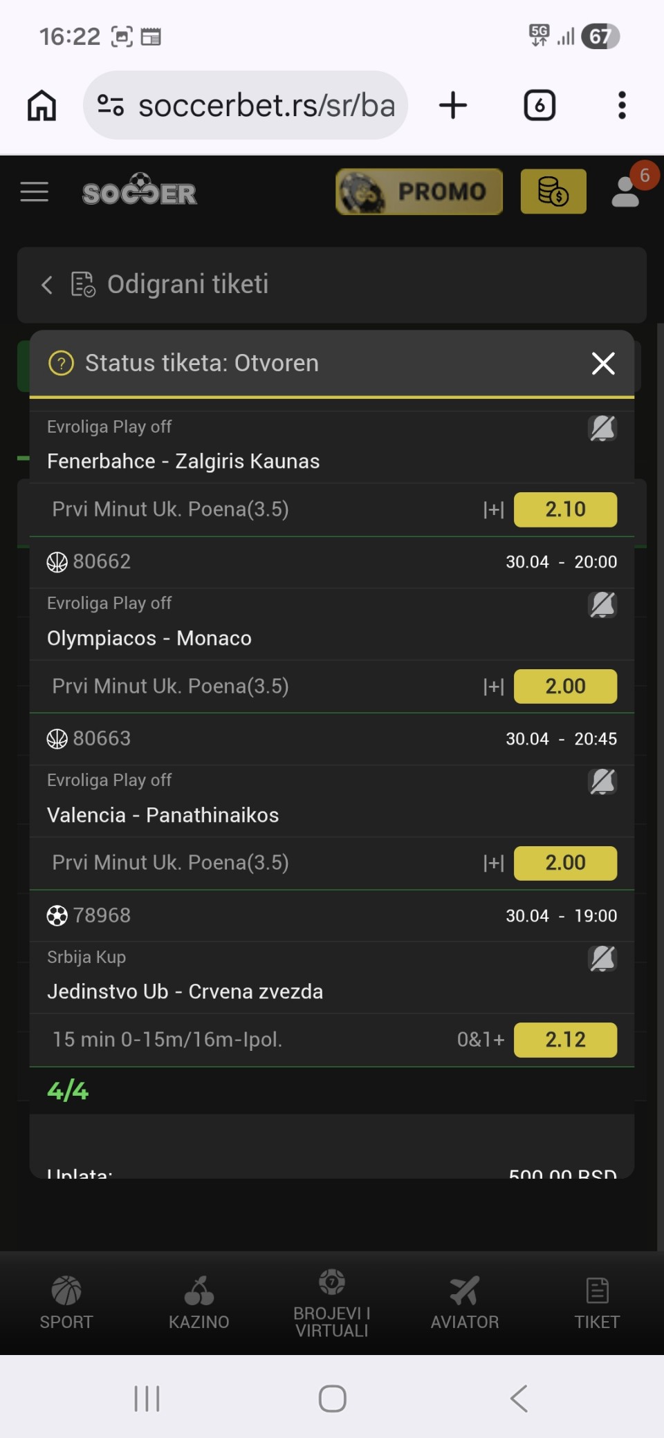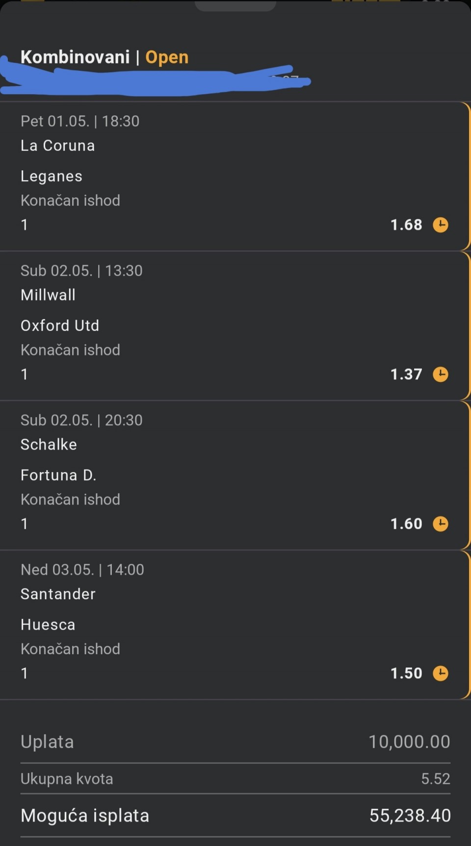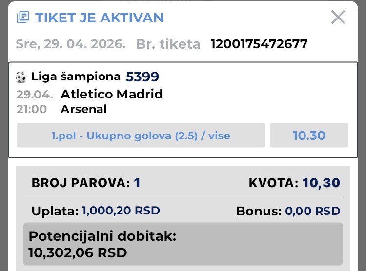 02.05.2026. 18:30h Bayer Leverkuzen - RB Leipzig; tip: X; kvota: 4.10; uplata: 1.440,00 din.; isplata: 5.904,00 din.