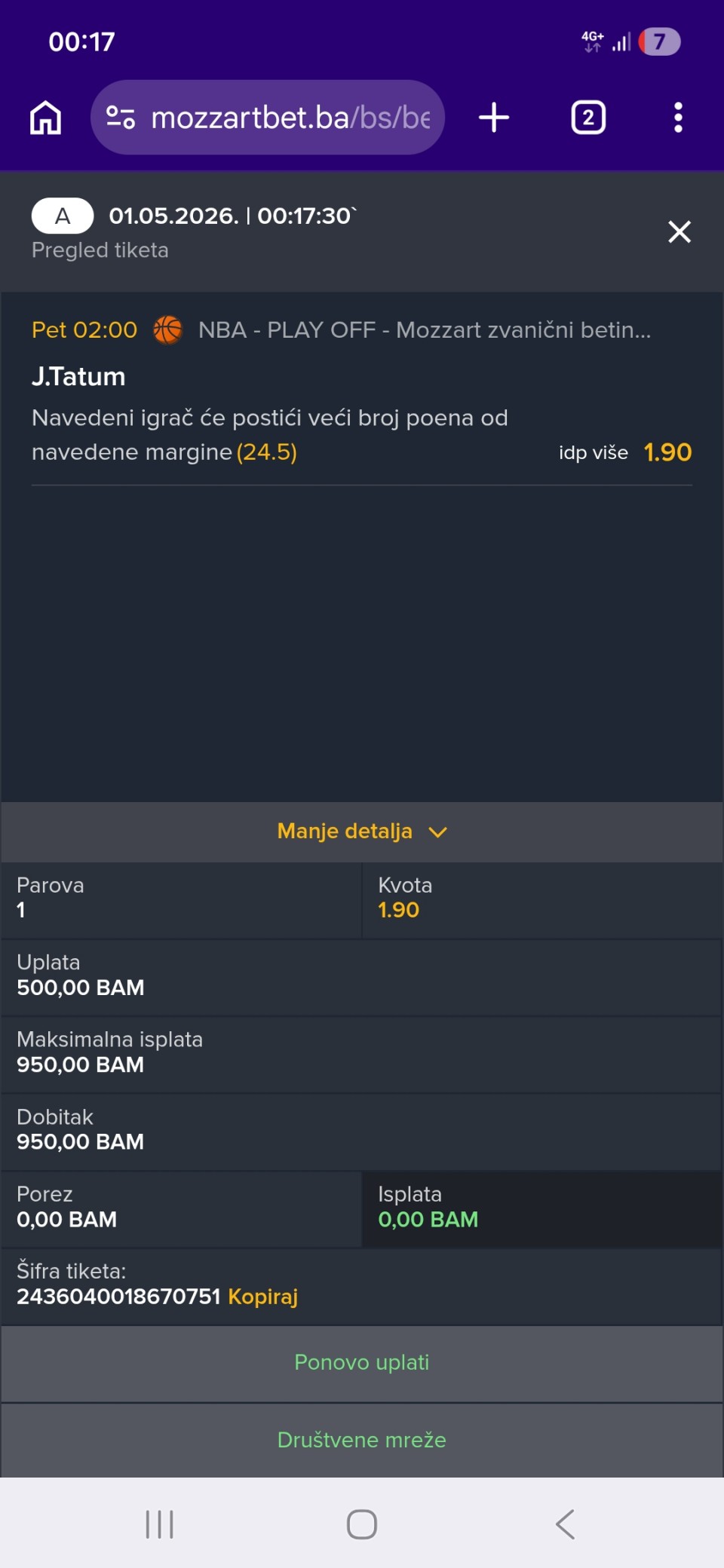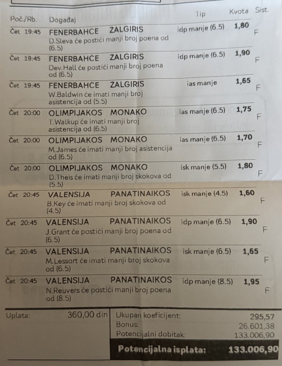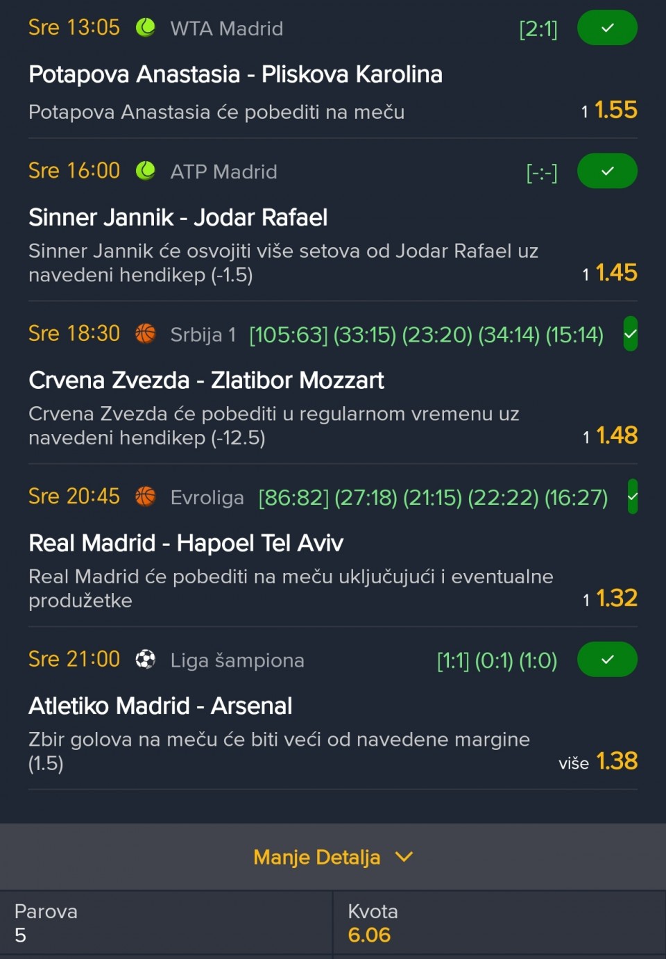 02.05.2026. 18:30h Bayer Leverkuzen - RB Leipzig; tip: X; kvota: 4.10; uplata: 1.440,00 din.; isplata: 5.904,00 din.