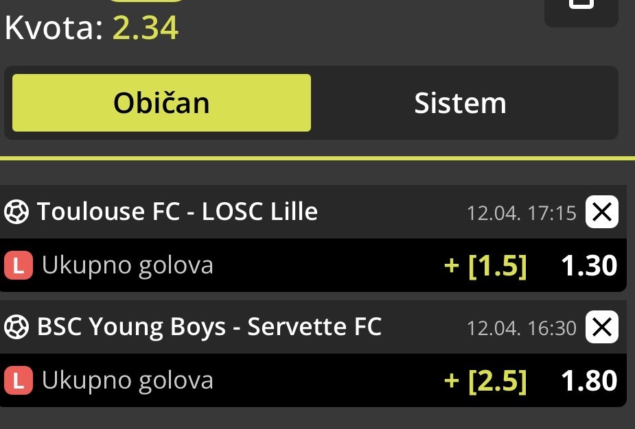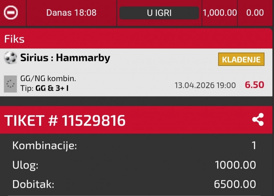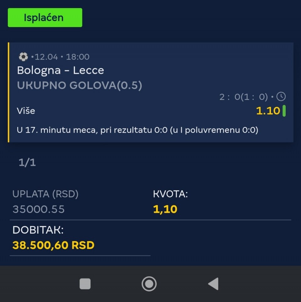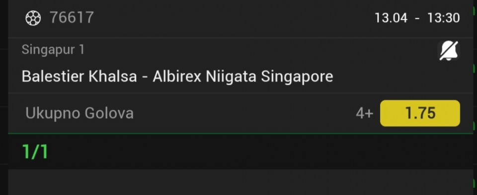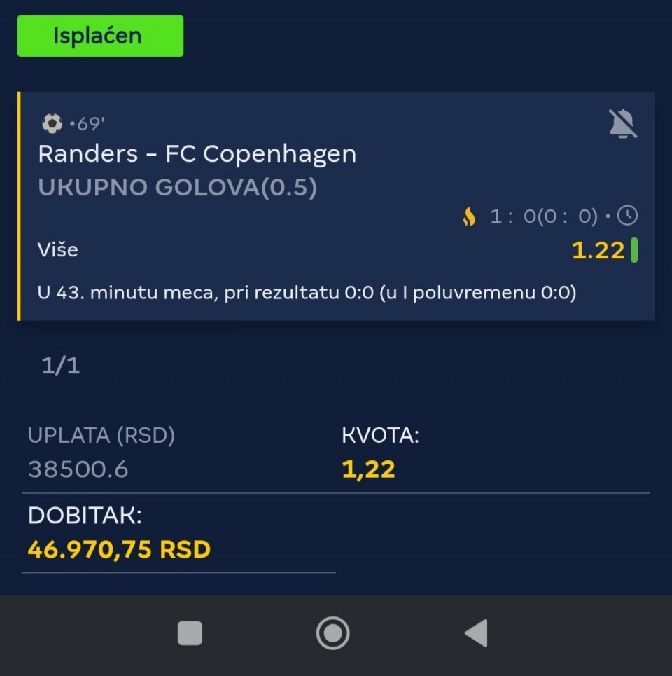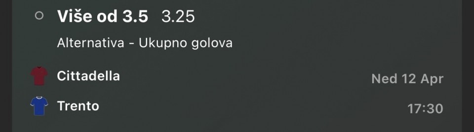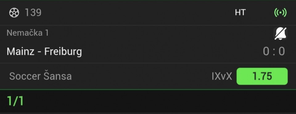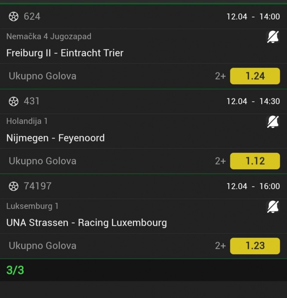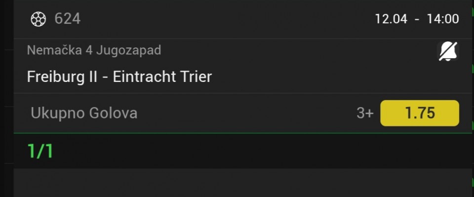 Serija 3+ golova se nastavilja u Frajburgu. Mislio sam da je pad. Na sofascore i na Aiscore stoji 0:1 90+10. Odjednom izbaci ft 4:1. Krivo mi bilo sto nisam odigrao i prelaz jer je bio jedan. Posle na 0:1 sam video da nije bilo u ponudi. Ceka se...Serija 3+ golova se nastavilja u Frajburgu. Mislio sam da je pad. Na sofascore i na Aiscore stoji 0:1 90+10. Odjednom izbaci ft 4:1. Krivo mi bilo sto nisam odigrao i prelaz jer je bio jedan. Posle na 0:1 sam video da nije bilo u ponudi. Ceka se jos jedan par na triplu. Sanse male za prolaz jer je 0:0 ht. Cekam još dva gola. Kasnije izbacujem još jedan singl koji mi je jako interesantan kao ovaj. Show more