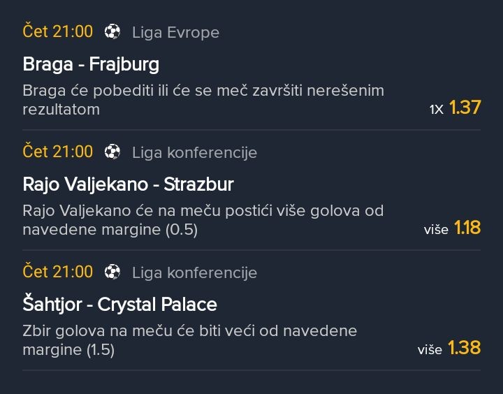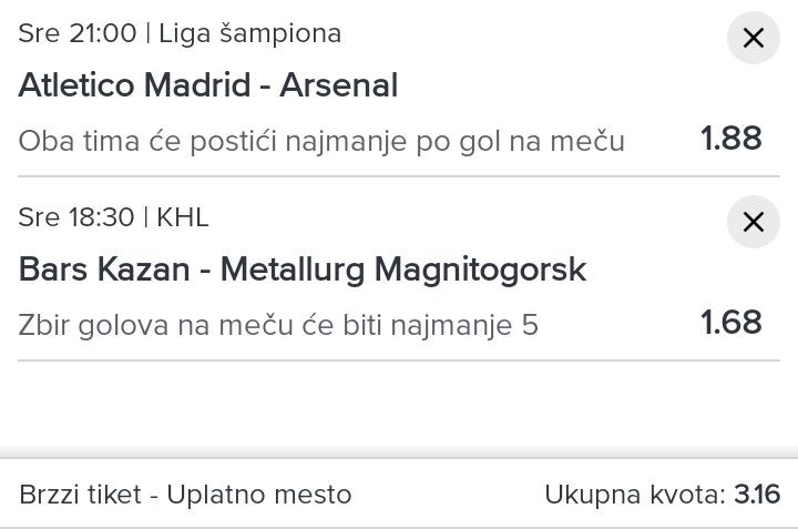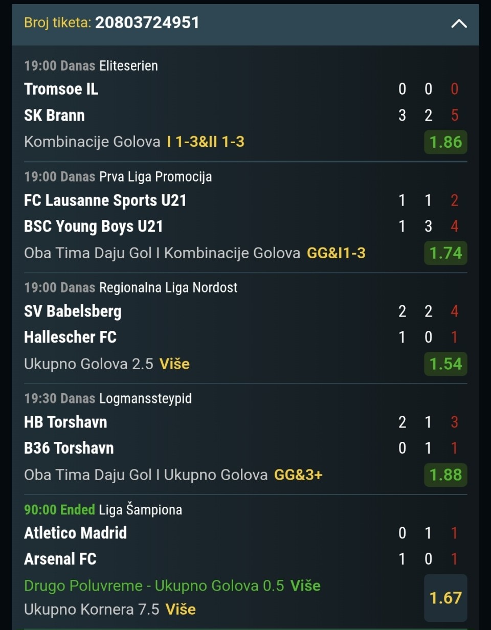 Pozdravi. Evo nešto što sam igrao za danas na Mozzartu (Bhplay). Ako se nekome nešto sviđa neka probere i oprezno sa ulogom, samo minimala jer sam primjetio da je narasla kvota na Omanski Muscat u gostima, gdje sam igrao čistu 2, kao što se da...Pozdravi. Evo nešto što sam igrao za danas na Mozzartu (Bhplay). Ako se nekome nešto sviđa neka probere i oprezno sa ulogom, samo minimala jer sam primjetio da je narasla kvota na Omanski Muscat u gostima, gdje sam igrao čistu 2, kao što se da vidjeti. Sretno ako neko nešto probere jer i nije baš neka ponuda danas. Show more