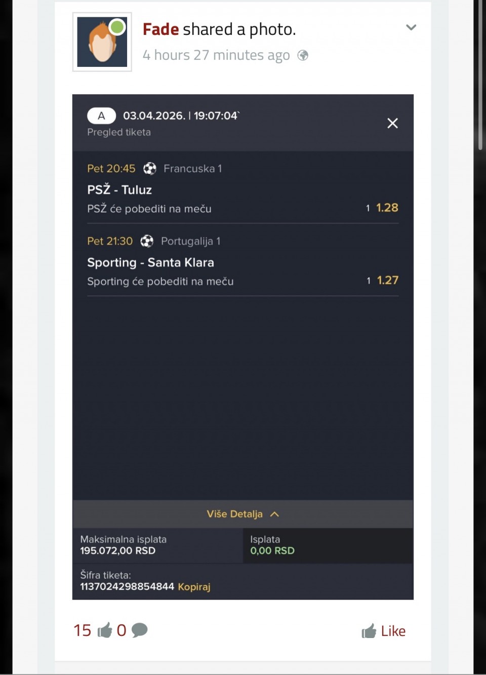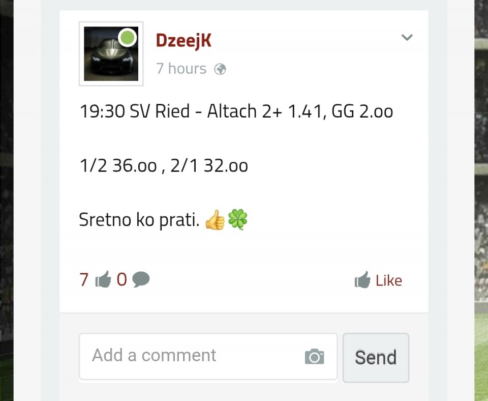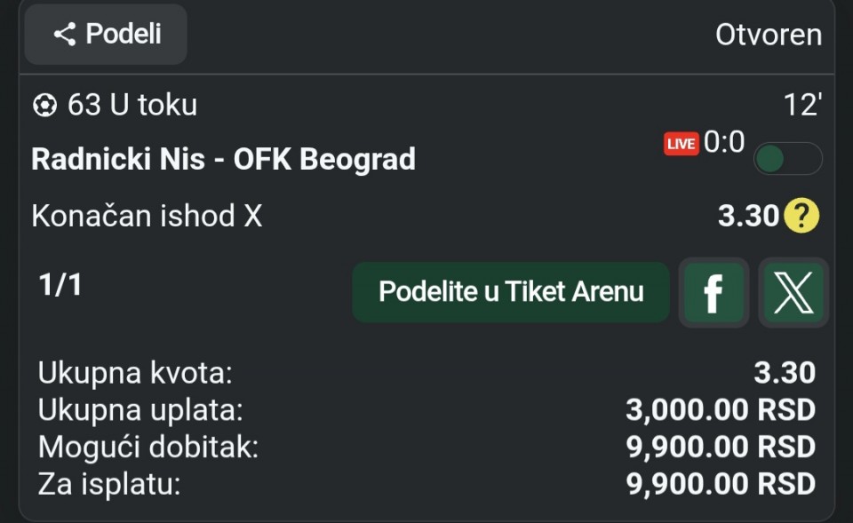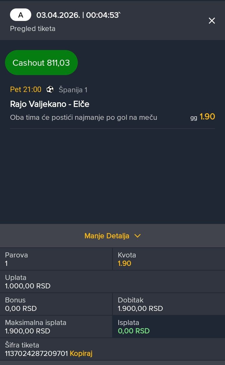 Za večeras sam iskombinovao ovo, vidite ulog i kvotu. Nisam se mnogo zalijetao jer su mi večeras nekako sve tekme škakljive. Postavit ću i drugi rizičniji tiket u komentaru koji se sastoji većinom od igrača koji izlaze iz povreda i traže formu...Za večeras sam iskombinovao ovo, vidite ulog i kvotu. Nisam se mnogo zalijetao jer su mi večeras nekako sve tekme škakljive. Postavit ću i drugi rizičniji tiket u komentaru koji se sastoji većinom od igrača koji izlaze iz povreda i traže formu.