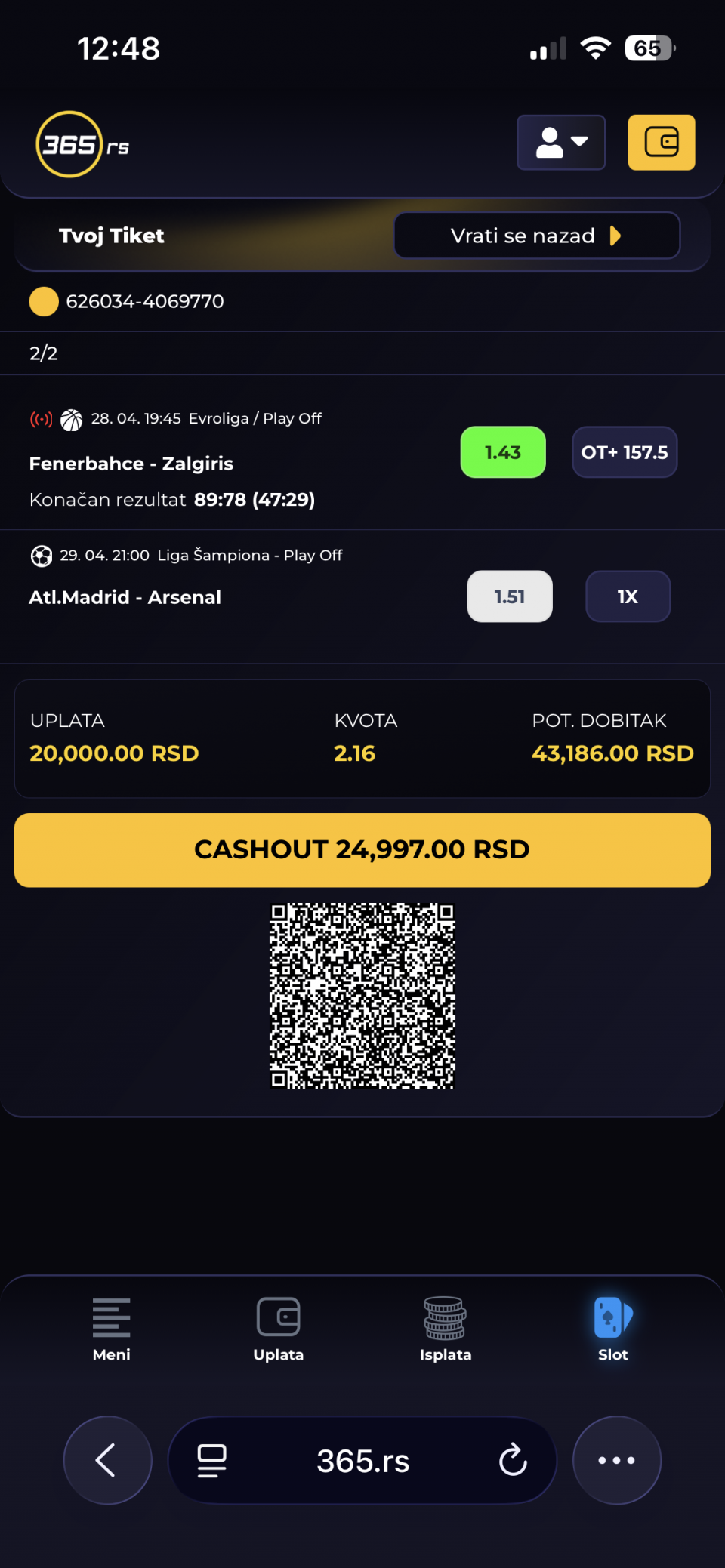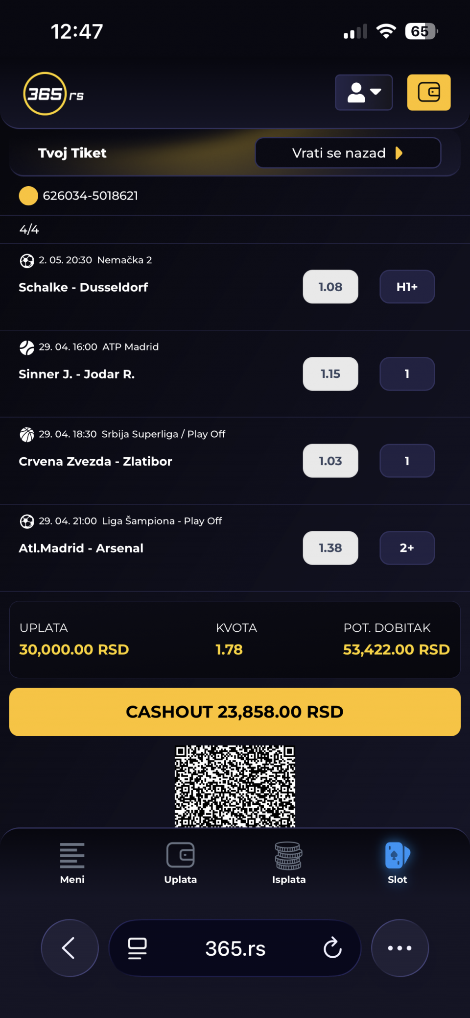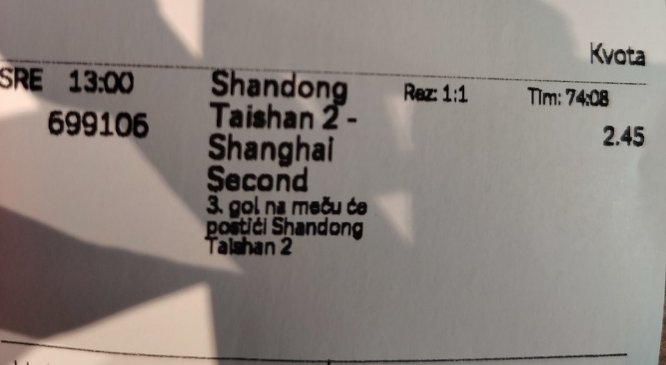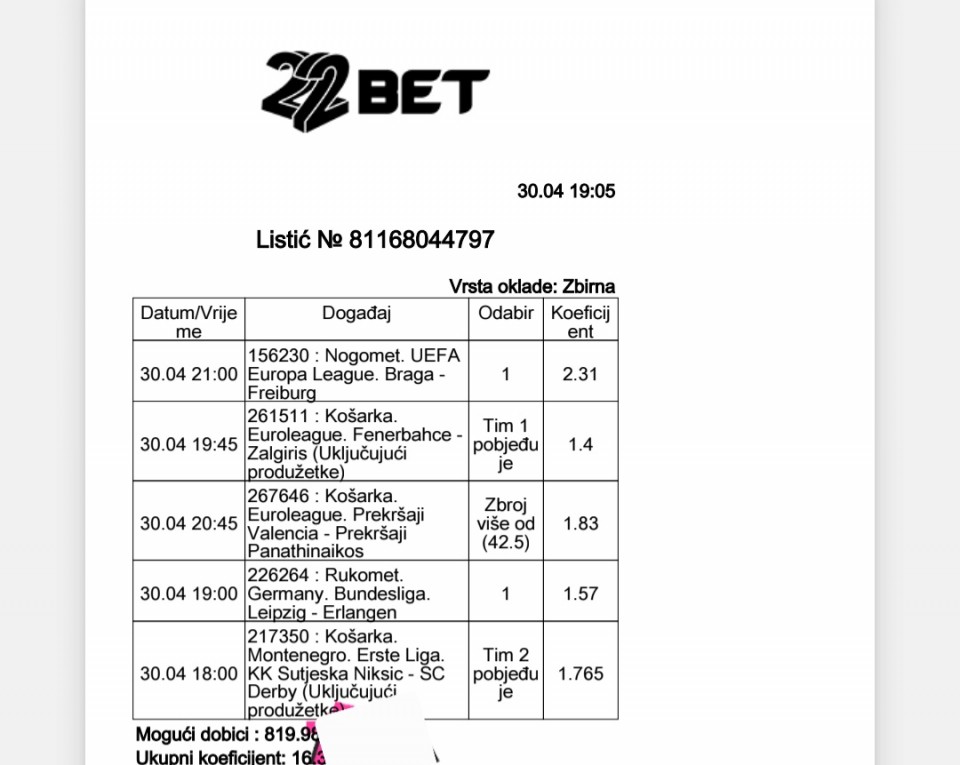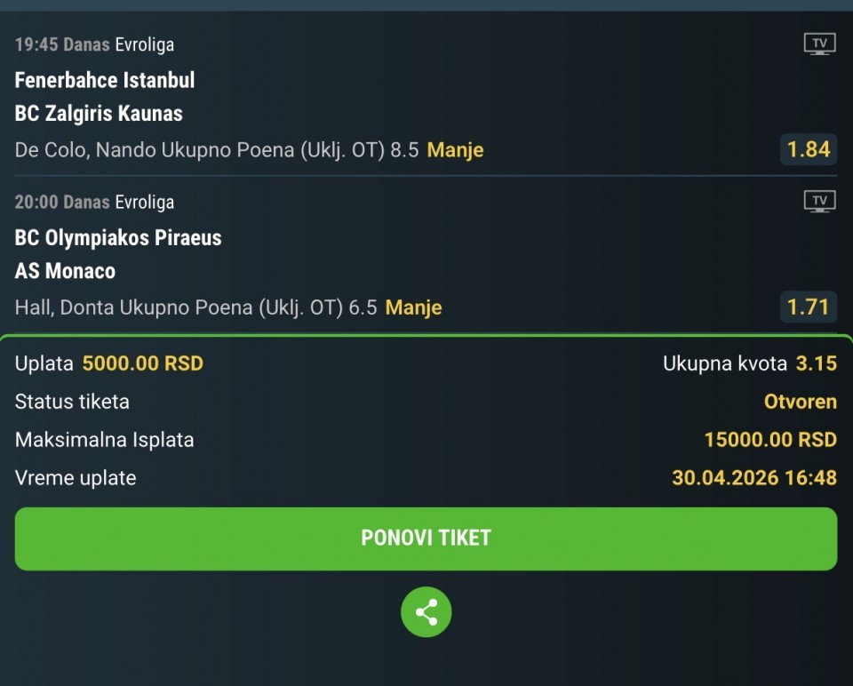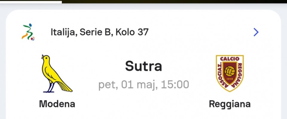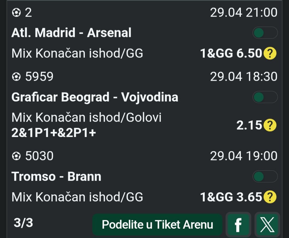 01.05.2026. 15:00h Bari - Entella; tip: X; kvota: 3.25; uplata: 11.520,00 din.; isplata: 37.440,00 din.