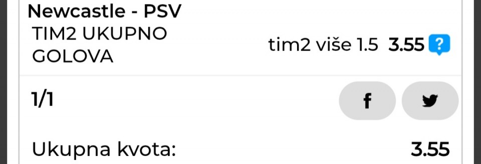 Biti ili ne biti za psv, zadnje kolo igraju sa bajernom, tako da mislim da ce ovde napasti cak i pobedu. Treba napomenuti da su u engleskoj razmontirali liverpul sa 4:1 i da su dobili napoli 6:2, tako da bi bila greota da ne...Njukasl psv x2 3,10