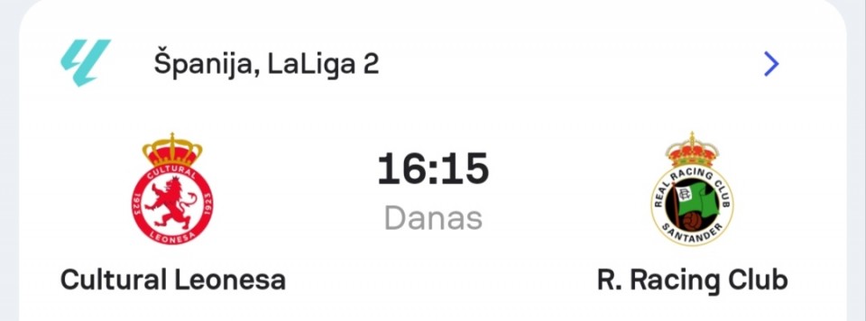 Po meni fix dana. Santander u nizi od 3 pobeda za redom,a Leonesa je u losoj formi. Pobedu nisu videli od 17.12.2025 u pitanju je bio kup,a u ligi 7.12.2025 su pobedili Eibar u gostima. U prvom mecu ove sezone,Leonesa je pobedila sa 2:4.Verujem u motivisan Santander!