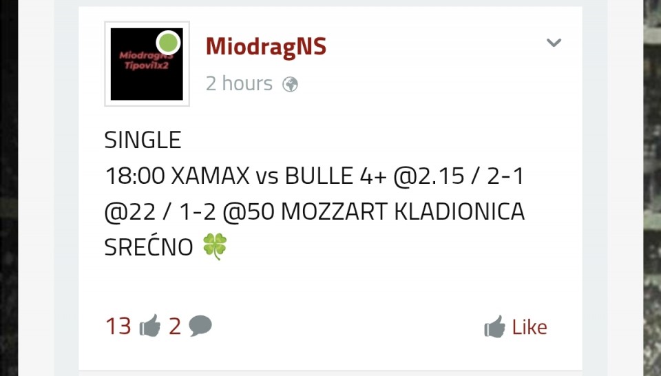 18:00 XAMAX vs BULLE 4+ @2.15 / 2-1 @22 / 1-2 @50 MOZZART KLADIONICA