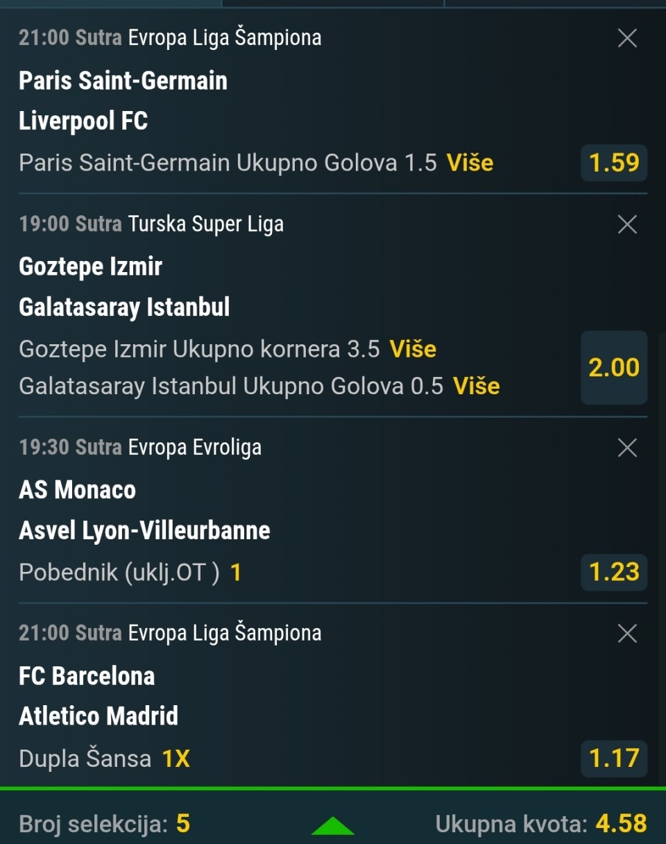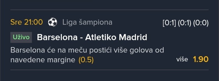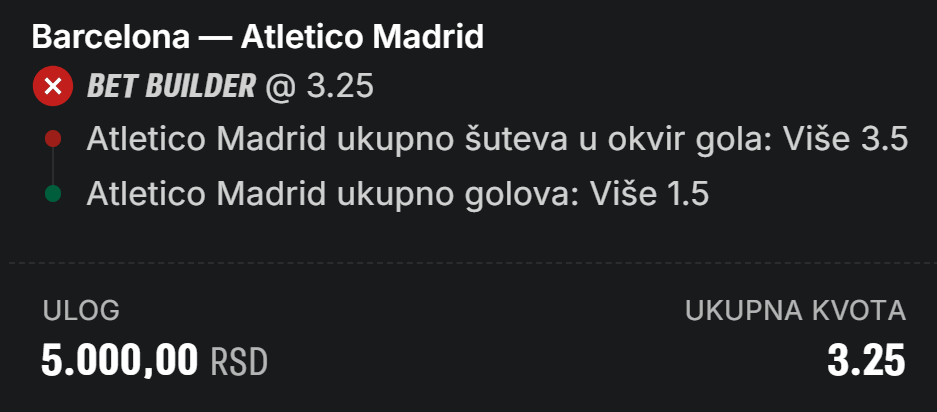 U ovoj sezoni Barselona nijednom nije uspela da sačuva svoju mrežu, dok Atletiko samo jednom (protiv Arsenala) nije uspeo da postigne gol. Ako tome dodamo formu Atletika koji je na poslednja 4 susreta u LŠ postigao 14 golova, kao i to da Barselona na 2 od 3 poslednja susreta na svom terenu prima dva gola, ovaj tip sa golovima uopšte nije tako nedostižan. Onda možemo i da pogledamo poslednje njihove susrete na ovom stadionu, gde neću računati poslednji jer je tu Atletiko došao da brani 4:0 iz prve utakmice kupa - na 2 od 3 susreta pre toga Atletiko je davao minimum 2 gola, a u trećem je dao gol i propustio još 3 velike šanse - tako da kad hoće Atletiko može i te kako da naudi Barseloni na njihovom stadionu. Što se tiče SoT, Barselona je čitave sezone uspela na samo 3 utakmice da dozvoli manje 3.5 SoT i to je bilo svaki put protiv slabijih protivnika - Sparta, Olimpijakos i Kopenhagen - kad god je iole neki ozbiljniji protivnik sa druge strane SoT ide preko 3.5, čak i na ovom stadionu - PSG, Ajntraht i Njukasl. I onda imamo Atletiko koji opet samo na jednoj utakmici čitave sezone nije imao više od 3.5 SoT (naravno već pomenuta protiv Arsenala). Tako da za kraj rezimiram, očekujem minimum 4 SoT Atletika od kojih će bar dva završiti u mreži Barselona...