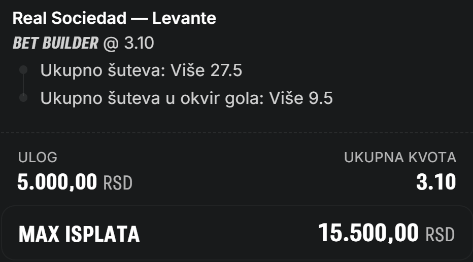 Susret dva tima koji jure 3 boda, svako iz svojih razloga - Sosijedad da se dokopa mesta koje vodi u Evropu, a Levante da se spasi od ispadanja - pa stoga očekujem utakmicu bez mnogo kalkulisanja i gde bi oba tima...#1 14. nedelja - 1. korak ⚽