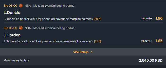 Ovde ne bih mnogo duzio sa analizom Doncica ocekujem cak i na 40+ da izadje ovo im je LA derbi takoreci, Harden isto vrlo vrlo dobar u poslednje vreme na proseku je od 28 poena a ovde ce sigurno imati i dodatnu motivaciju a ni minutaza nece nedostajati. Predostroznosti radi obojica odigranu u mozzartu na nizim granicama. Koliko vidim mozzart jedini nudi 31.5 za doncica pa je i ova -2 29.5 bas dobra. Ako bih birao single neka bude Doncic ali mislim i da ovaj dubl ulazi bez problema. Moj ulog 1000Rsd.