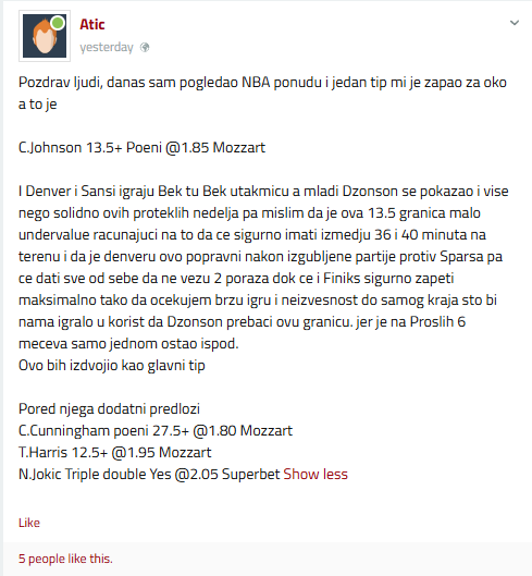 C.Cunnigham 28.5+ @1.97 (29) ✅ (Mozz je odmah sklonio 27.5 pa smo uzeli po ovoj vecoj granici...Sinoc 3/4 sasvim solidno vece, 100% ucinak nam je pokvario Jokic koji je za 1 skok ponovo ostao uskracen za Triple Double