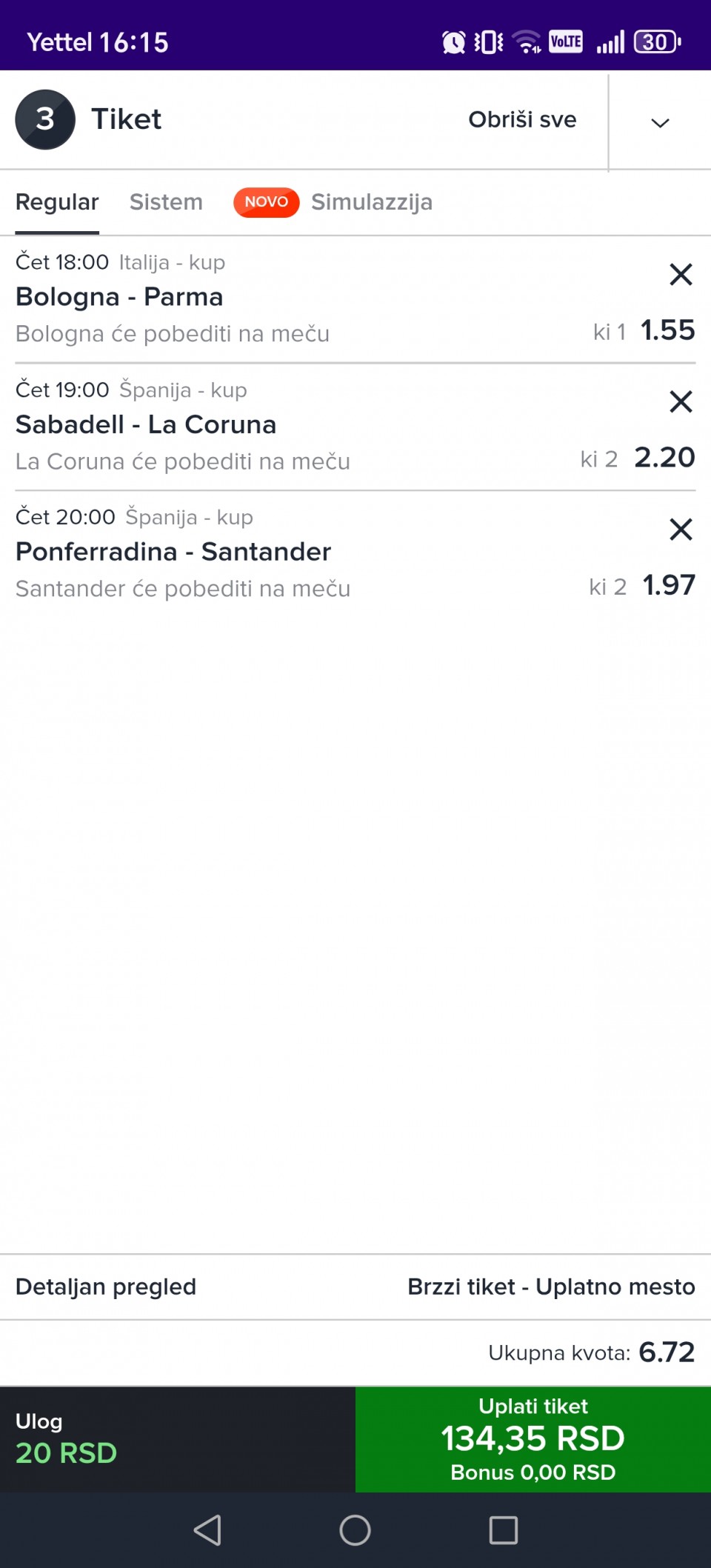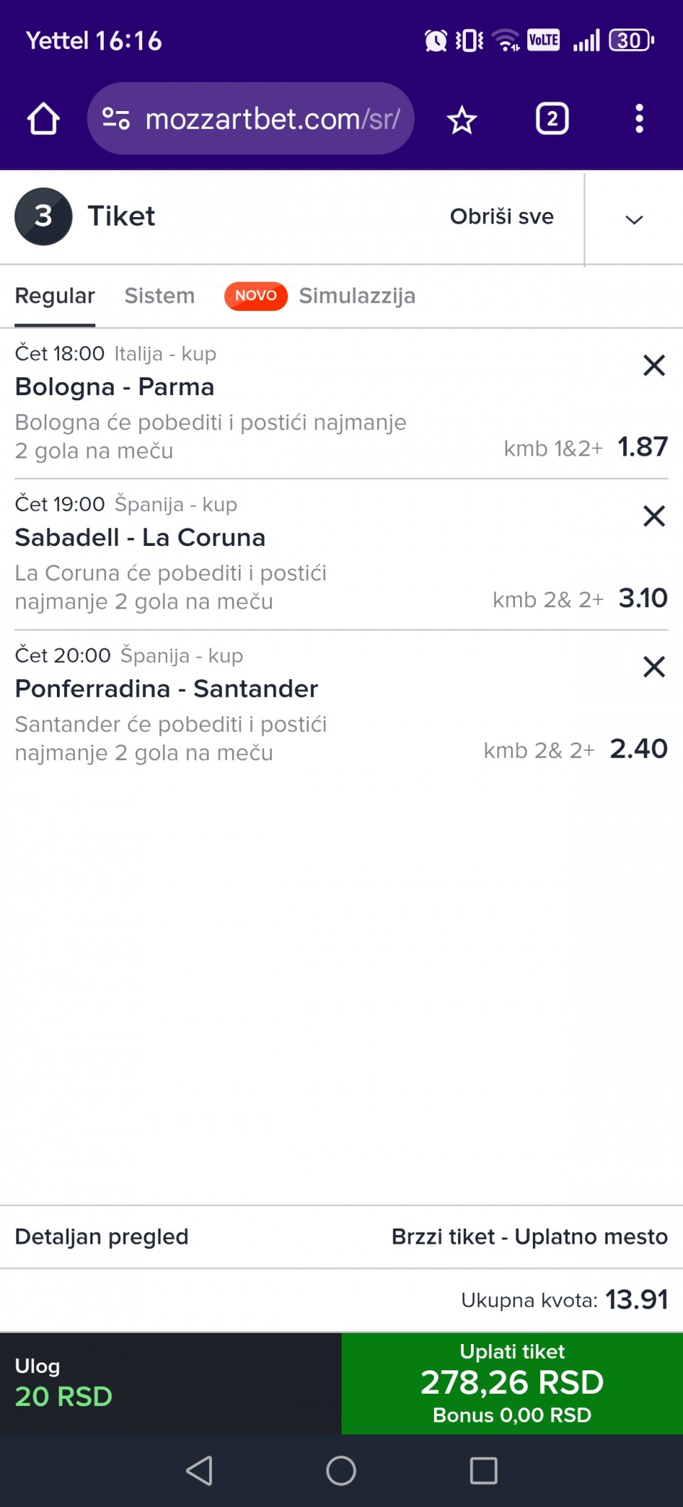 ukupno igram 30 tiketa, i na poslednjem pravim presek stanja, progresivno jurim jedan tiket dnevno, a ulog dižem duplo nakon svakog pada