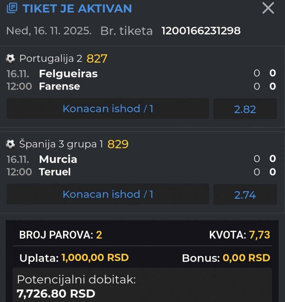 Novembar score 12/17, juce unit +6.8 , ukupan unit +44.24