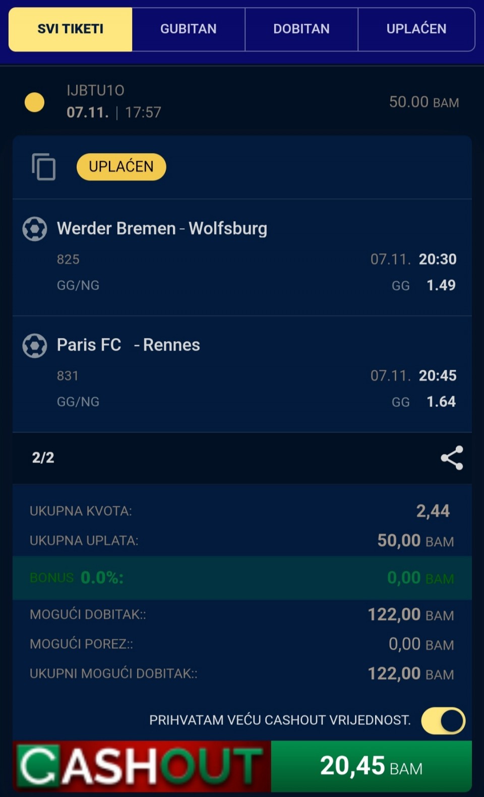 Pozdrav braco, idem pokusati od 50KM (25€) napraviti do kraja sedmice nekih 200€ pa sretno ako tko isprati 🍻 ⚽ 20:30 Bremen - Wolfsburg GG ⚽ 20:45 Paris - Rennes GG