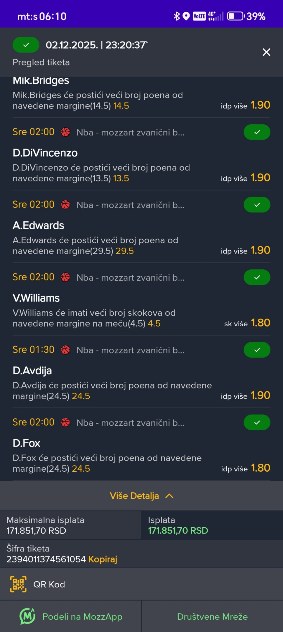 Idemo kratak recap sto se sinocnjeg NBA-a tice, malo slabiji, odnosno polovican ucinak od prosla 2 dana, veceras 2/4 s tim da sam jedino zadovoljan sto je taj dubl prosao makar, odnosno ta dvojica koje sam naveo da su malo sigurniji, procicemo...Idemo kratak recap sto se sinocnjeg NBA-a tice, malo slabiji, odnosno polovican ucinak od prosla 2 dana, veceras 2/4 s tim da sam jedino zadovoljan sto je taj dubl prosao makar, odnosno ta dvojica koje sam naveo da su malo sigurniji, procicemo detaljno kroz sva 4 tipa sada.