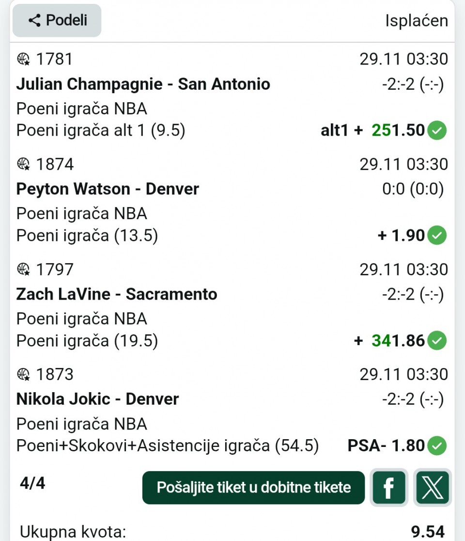 C.Cunningham poeni 27.5+ @1.80 Mozzart