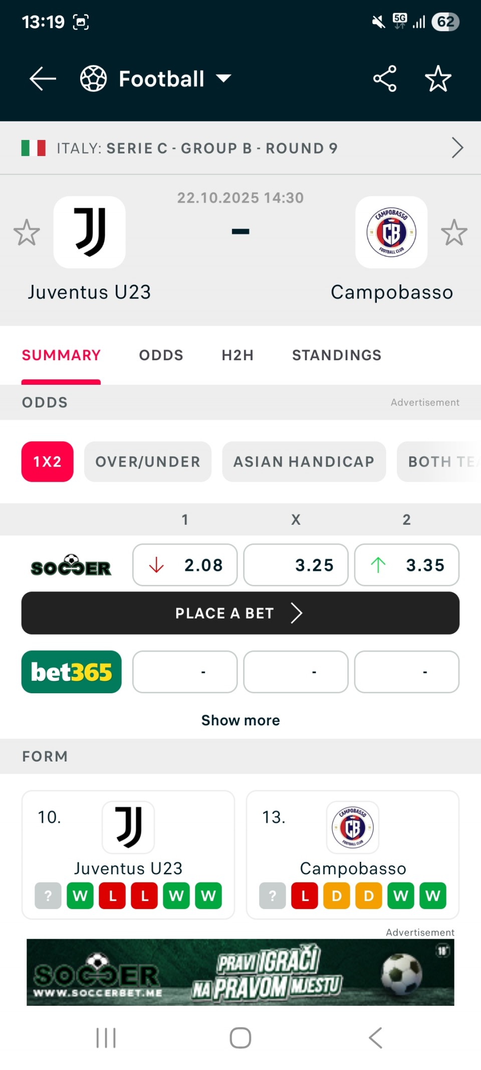 Tip dana ocekuju se golovi i prvo i drugo poluvrijeme za prave ljubitelje Italijanske serije C moj tip I P1+ & II D1+ prvo i drugo poluvrijeme po jedan gol minimum kvota 1.79. Hvala