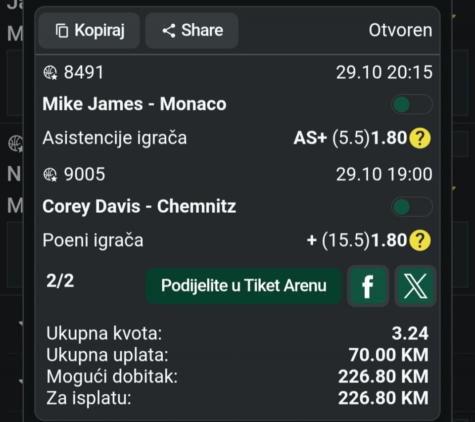 Evroliga&Evrokup danas, juce smo imali jedan prelagan prolaz u vidu Monekea i Wrighta, danas biram Mike Jamesa najboljeg igraca Monaka, lopta je u 80% napada kod njega, proigrava saigrace, cesto ga udvajaju pa se rijesava lopte jako intaligentno i tako uposljava saigrace prelagano. Sto se tice drugog pika imamo Davisa koji je jako dobar skorer, gadja solidno za tri poena ali vise cemo ga gledati kako ide u prodor igru i pokusava tako da dodje do laganih poena. Cesto se nalazi na liniji penala, pratio sam utakmicu protiv Besiktasa kada je brojao do 22 odlicna njegova partija. Negdje sam bio procitao da Yebo ima manju povredu pa u slucaju da njega danas ne bude ovo je prelagan +. Eto toliko, srecno svima ajde da se i danas zeleni!! 🤝🎩👍🏻🍺🍀