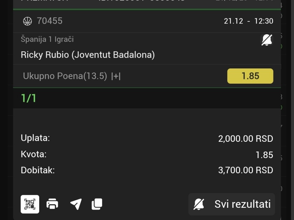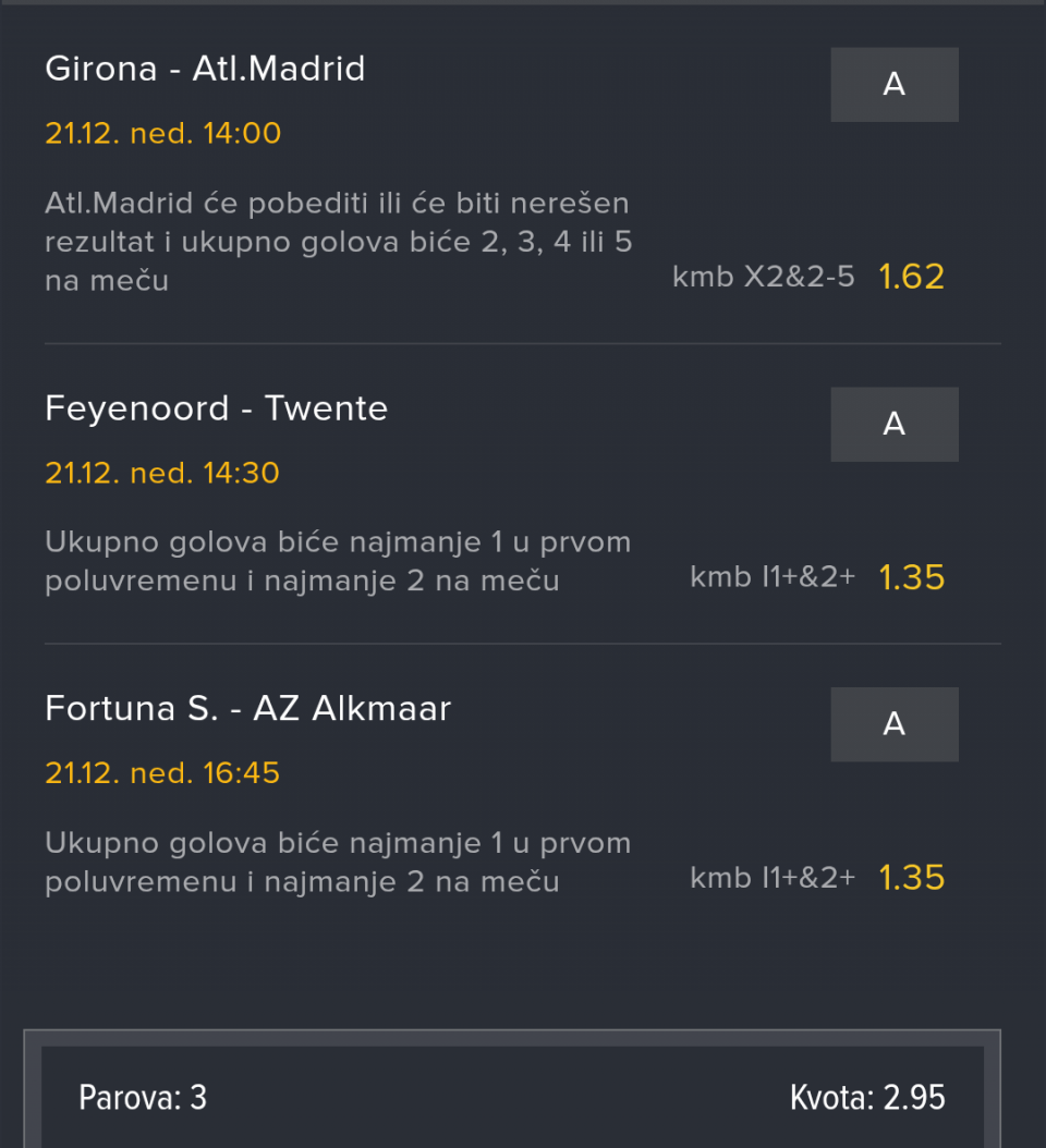 21.12.2025. 12:15h Den Bosch - Vitesse; tip: X; kvota: 3.90; uplata: 11.520,00 din.; isplata: 44.928,00 din.