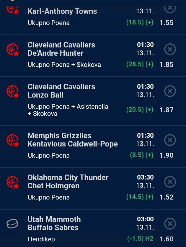 Puno pikova iz klivlend - majami meca jer mi je najzanimljiviji veceras zbog izostatka dosta igraca, za majami hakez najvise profitira, i jutros mu je granica bila 24.5 sada je vec na 26 i ne bi me cudilo da ode i do 28,29.5, samo cu reci da je prekjuce imao CAK 24 SANSI za skok, i 10 Potencijalnih asistencija, i ponavljam moj omiljeni igrac sa Kyshawnom Georgom ove sezone koga cu sigurno pratiti!