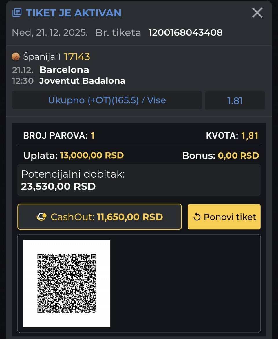 21.12.2025. 15:00h Sassuolo - Torino; tip: X; kvota: 3.15; uplata: 360,00 din.; isplata: 1.134,00 din.