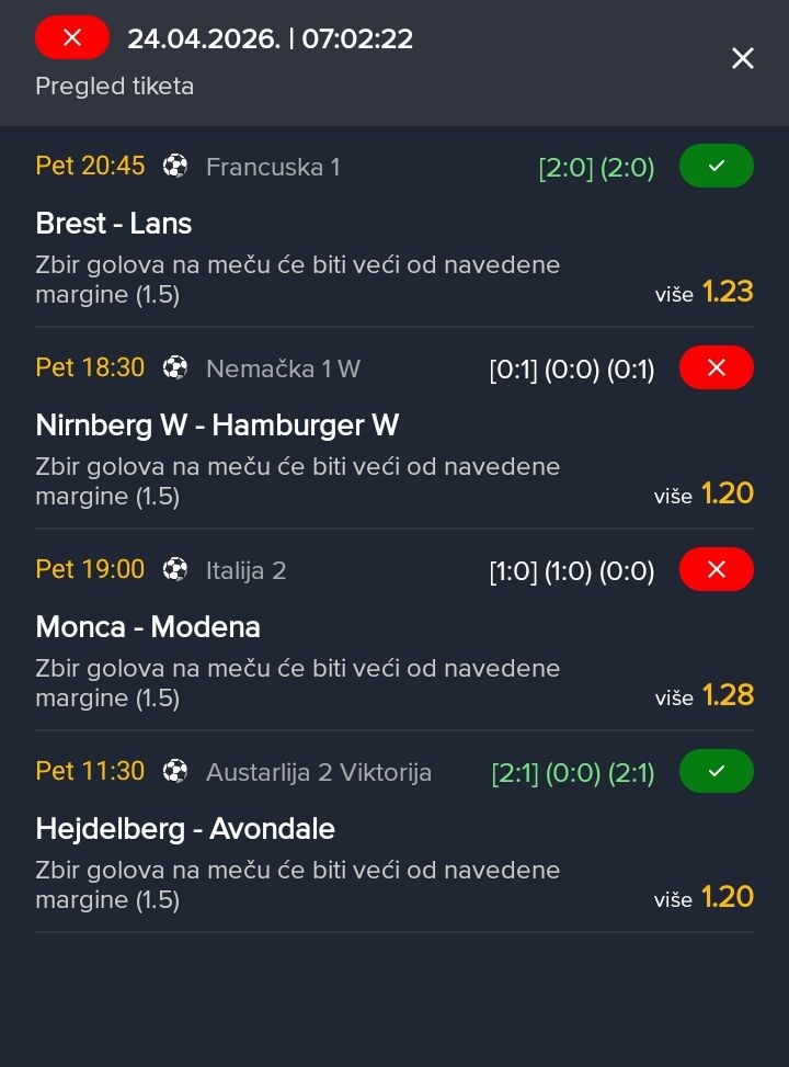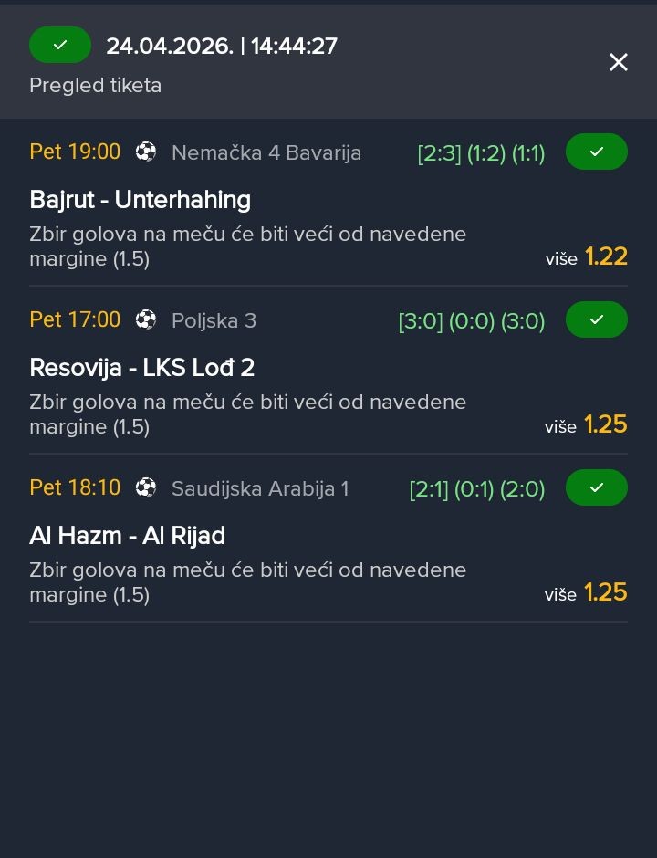 Juče sam krenuo sa ovim sistemom klađenja, tiketi su 2/2, lep profit sam ostvario.
