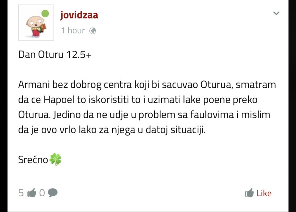 Armani bez dobrog centra koji bi sacuvao Oturua, smatram da ce Hapoel to iskoristiti to i uzimati lake poene preko Oturua. Jedino da ne udje u problem sa faulovima i mislim da je ovo vrlo lako za njega u datoj situaciji.