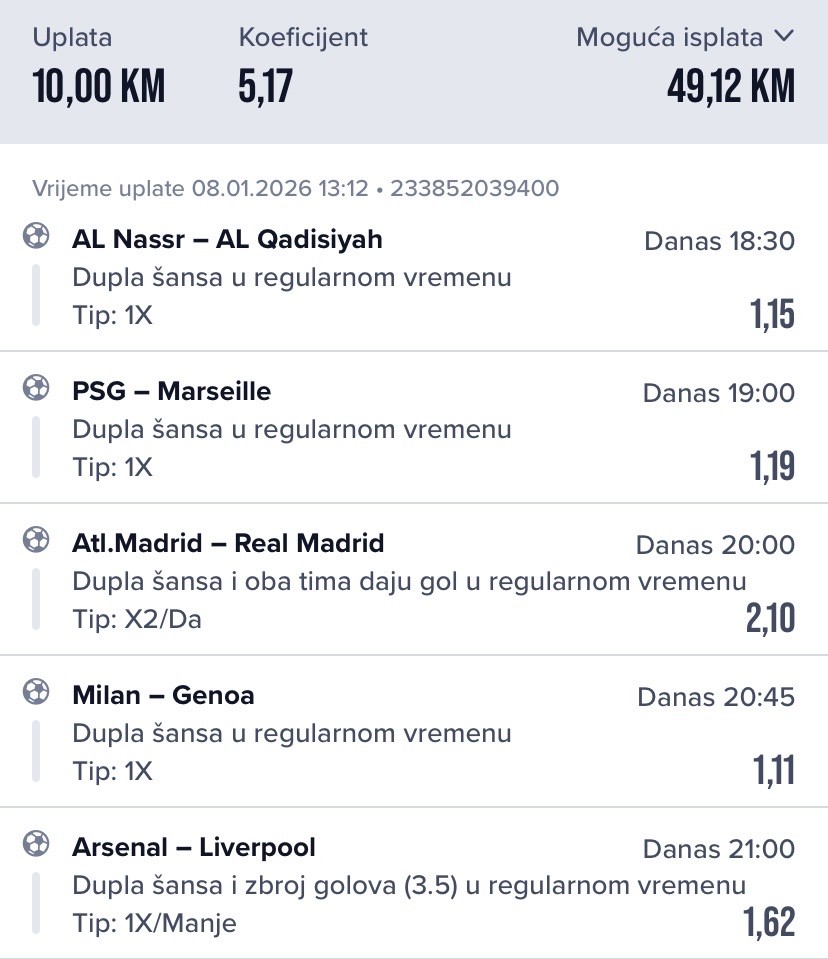 Izaberite šta vam odgovara ili rizikujte pa igrajte sve. Uglavnom kad igram ovoliko mečeva očekujem da će neki pasti pa povratim gubitak na narednom od...Moji favoriti za danas pre Nemaca za igru 1/3 1.5+ i 2/3 1.5+ ako zatreba u slučaju pada u prvoj.