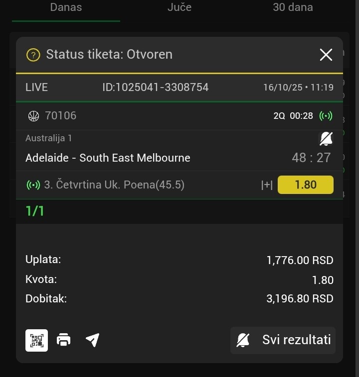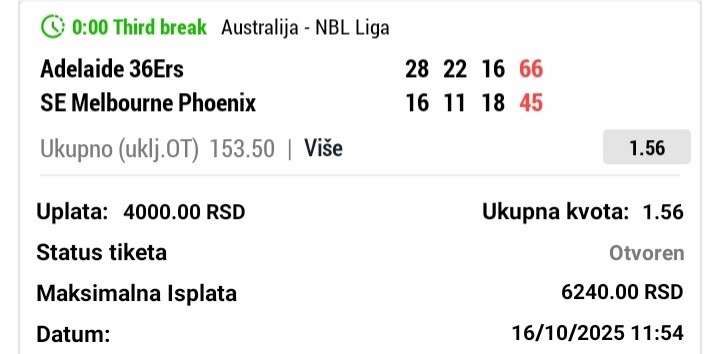 Sam start sezone u Australiji nikako ne obecava za nas kladionicare da cemo ista ubosti. Sto reče QPR naš stari član i tipser ovog sajta u prvoj bude 60 poena već iduća jedva 30 poena kao da su vezane ruke. Kad god imam vremena ispratim granicu pred početa četvrtine koja se nudi pre samog meča granice su se kretale 47.5, 48.5 49.5 samo se kvota menjala od 1.65-1.95. Ako samo malo mućnete glavom shvatićete da je za košarku poput australijske isuviše velika granica neko će reći da lupam ali takvi ciglari se retko kad viđaju košarka koja se igra trči šutni nema nikakve sigurnosti da će oni prebaciti tu granicu dešava se da daju od 55 olako ali ćeč u idućoj vidite i sami koliko su oni loš u preciznosti. Vćina ovih mečeva što je do sada odigrano otišla je u minus poena.