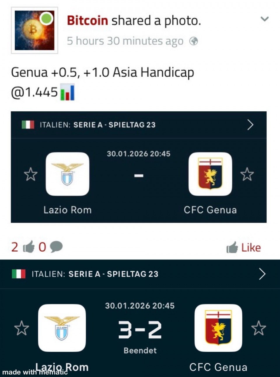 - прво полувреме доста пропуштених шанси, 3 велике шансе и xg1.89 за госта нису донели ни један гол, друго је кренуло раним голом Emmena, после буђење домаћина али ладно тек у 85мин за 1:1 и...(30.01) Анализа тикета