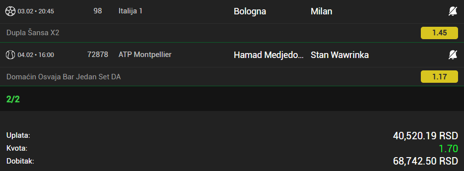 Bolonji nikako ne odgovara Milan kao protivnik - na poslednja 33 H2H duela Bolonja je zabeležila samo 3 pobede. Da, jesu dve od te tri pobede došle prošle sezone, ali u momentu kada je Bolonja bila hit prvenstva. Već evo prvi susret ove sezone na početku prvenstva, Milan je zabeležio laganu pobedu nedoopustivši Bolonji nijedan SoT. Od poslednjih 10 susreta na ovom terenu Milan je dobio 7, a na 5 od tih 7 je postigao min 2 gola. Bolonja je trenutno daleko od hita prvenstva - na poslednjih 10 utakmica samo dve pobede i to protiv najgoreg tima u Seriji A i najgoreg tima u LE. Na domaćem terenu u Seriji A nije zabeležila pobedu 3 meseca i stvarno bi bilo iznenađenje da je sad zabeleži protiv tima koji još nema poraz na gostovanjima u ovoj sezoni u prvenstvu. Dodatno, Alegri u 25 susreta protiv Bolonje kao trener ima 18 pobeda i niti jedan poraz...