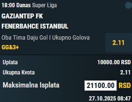 Gaziantep nakon dva uvoda poraza vezao je 7 utakmica bez poraza, tako da ovaj duel dočekuje u odličnoj formi i biće odmorniji od protivnika jer je Fener imao utakmicu protiv Štutgarta u međuvremenu. To im sigurno daje nadu da mogu da prekinu niz od 9 uzastopnih poraza i verujem da će učiniti sve da do toga i dođe. Na poslednja 3 H2H duela su uvek uspevali da postignu makar jedan gol, na poslednje 4 na svom terenu postižu minimum 2 (mada su samo jednom uspeli da sačuvaju svoju mrežu što je opet dobro za ovaj tip), tako da stvarno mislim da će se ova sezona razlikovati od prethodnih. A Fener iako igra "stidljivo" na strani što se tiče golova, zna povremeno da se desi opet GG4+ kao protiv Gancerbirligija ili Dinama. Verujem da će i ova utakmica biti efikasna jer Fener iz nekog razloga voli Gaziantep kao protivnika - na poslednja 3 susreta protiv njih su postigli 10 golova...