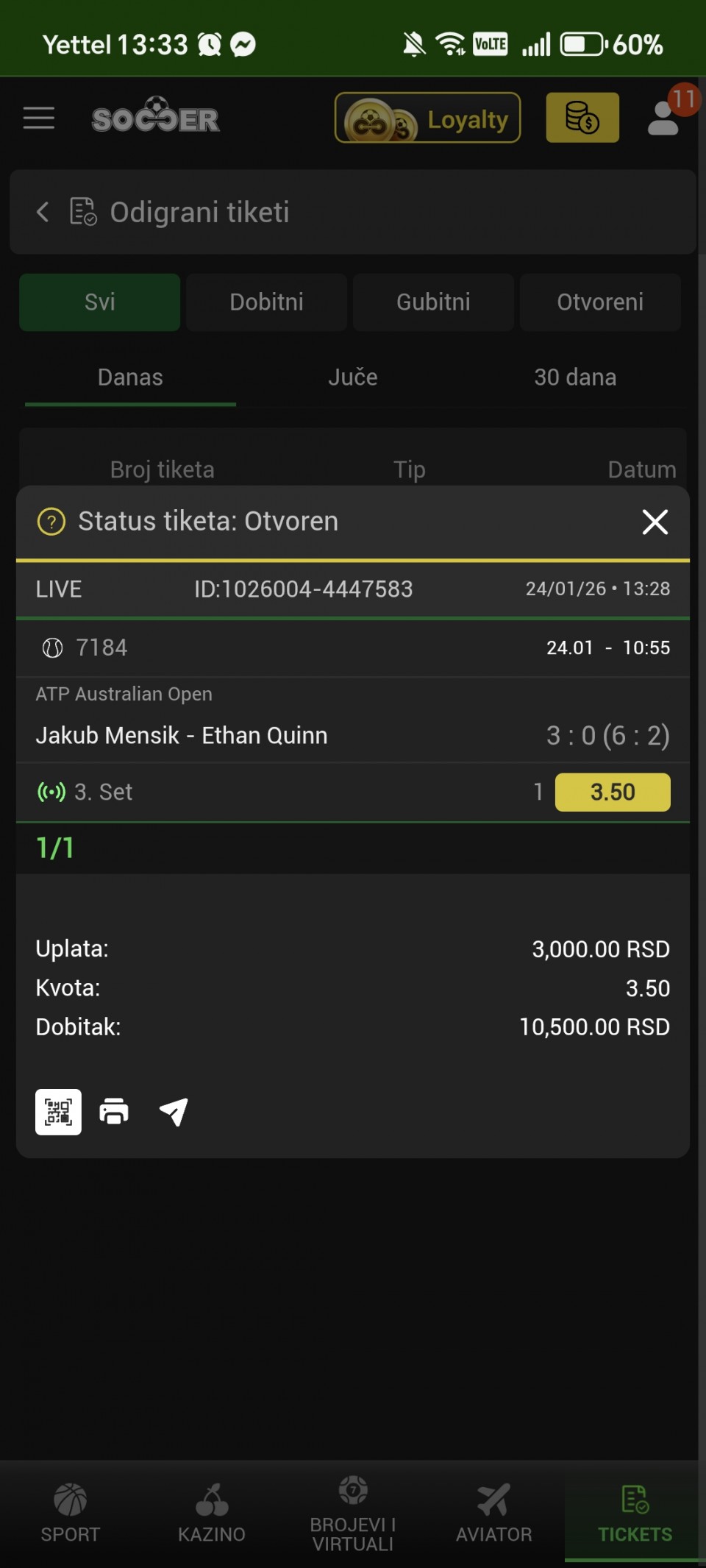 24.01.2026. 15:00h Como - Torino; tip: X; kvota: 4.15; uplata: 15.000,00 din.; isplata: 62.250,00 din.