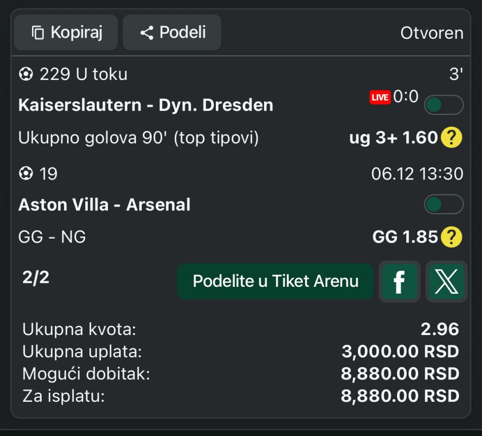 Arsenal očekuje najnezgodnije gostovanje u dosadasnjem toku sezone i ubedjen sam da AVL koja je u odlicnoj formi moze pronaci put do mreze na ovom meču i zadati velike muke gostima dok isto tako verujem u trenutno najjaci napad u PL , pa je ovaj...Arsenal očekuje najnezgodnije gostovanje u dosadasnjem toku sezone i ubedjen sam da AVL koja je u odlicnoj formi moze pronaci put do mreze na ovom meču i zadati velike muke gostima dok isto tako verujem u trenutno najjaci napad u PL , pa je ovaj tip logičan i po ovoj kvoti ogroman value! 🍻