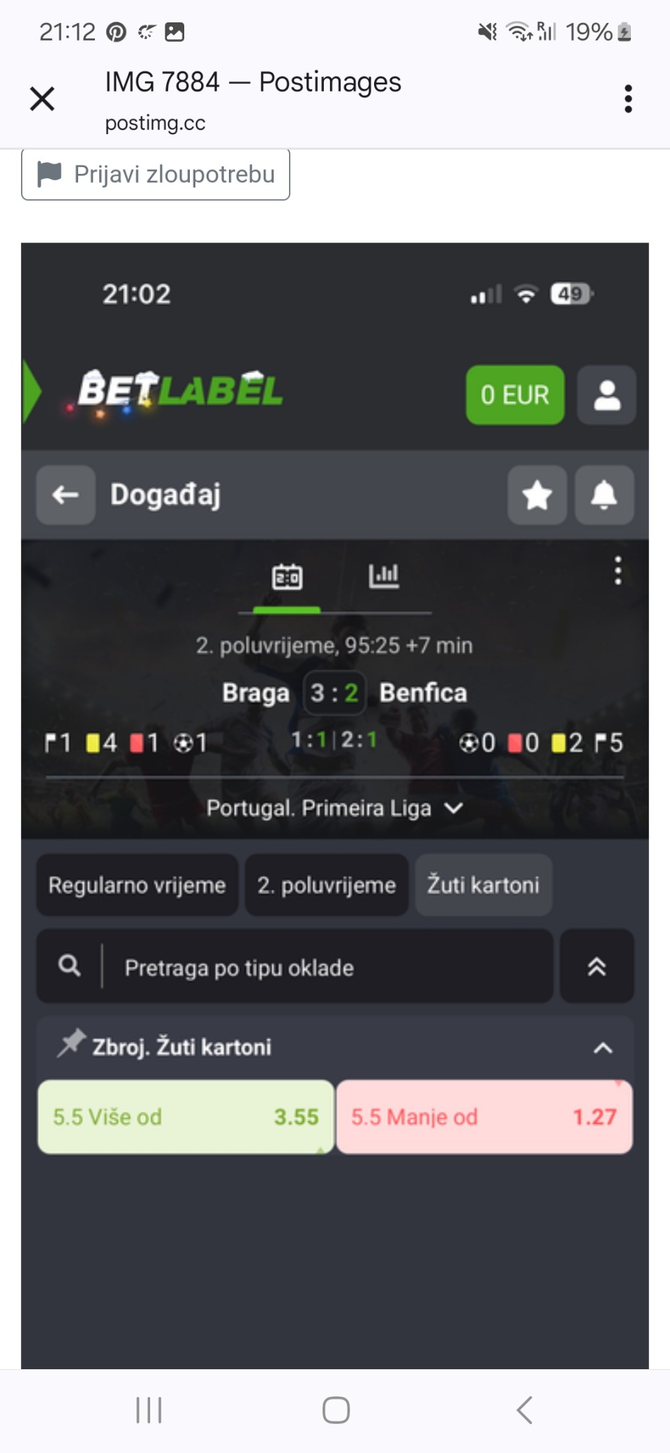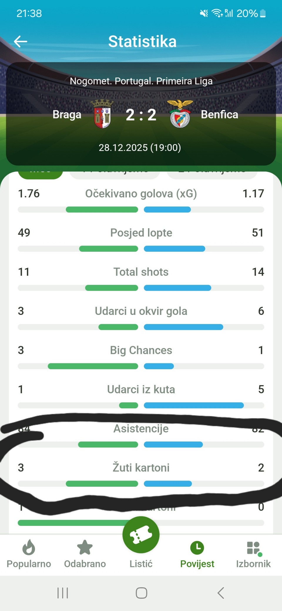 Imao sam Bragu-Benfiku 5,5+ kartona , na kraju zvanično pise u statistici 4:2 zuti kartoni i 1:0 crveni kartoni. Horta je dobio 2x zuti što znači crveni. Također u kladionici u kojoj sam igrao pisalo je 4:2 zuti u stats kao sto vidite na slici medjutim kad sam im poslao poruku (ima 20min) jos nisu odgovorili, stavili su onda 3:2 kartoni u statistiku.. Jel me neko zajebava ili sta sad da im radi čovek???