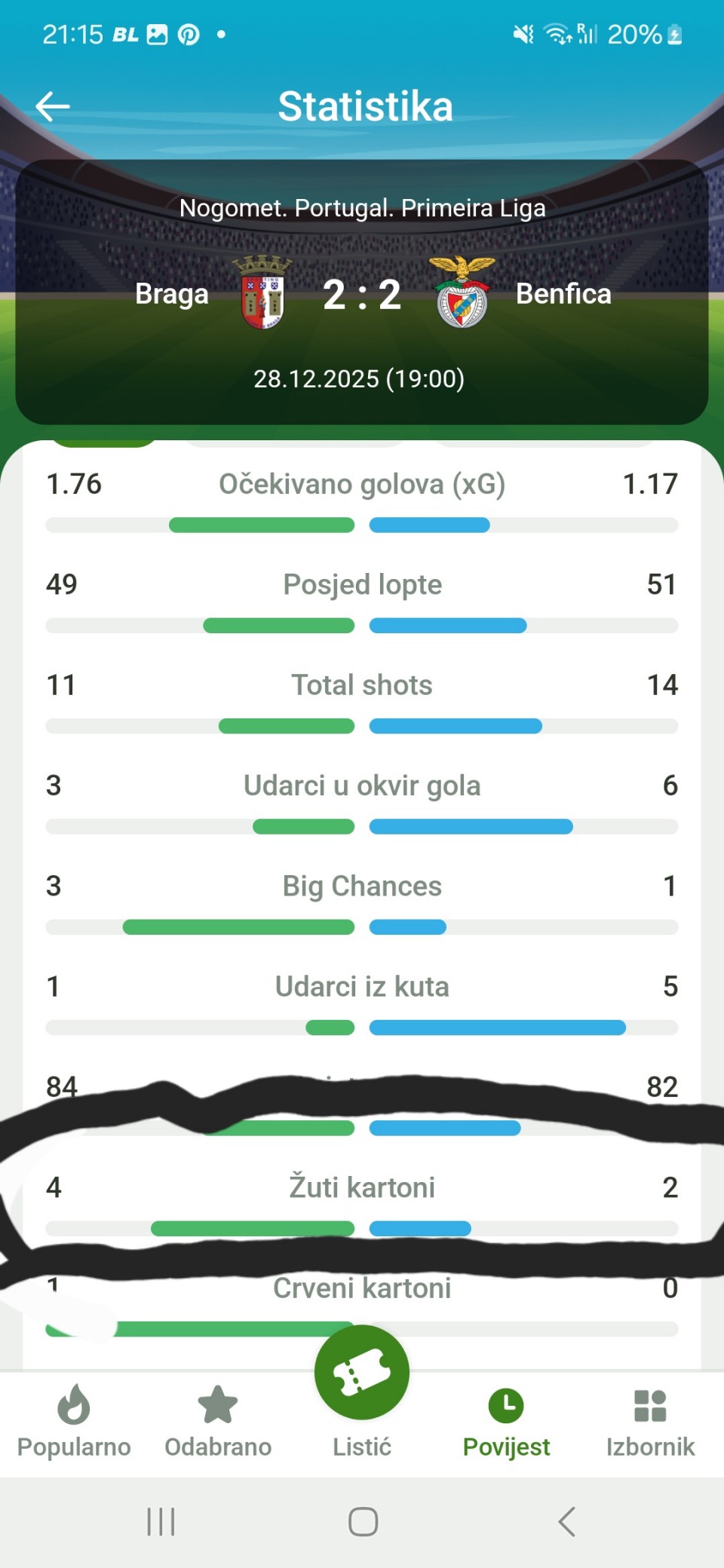 Imao sam Bragu-Benfiku 5,5+ kartona , na kraju zvanično pise u statistici 4:2 zuti kartoni i 1:0 crveni kartoni. Horta je dobio 2x zuti što znači crveni. Također u kladionici u kojoj sam igrao pisalo je 4:2...Moze neko da mi objasni ovu situaciju?