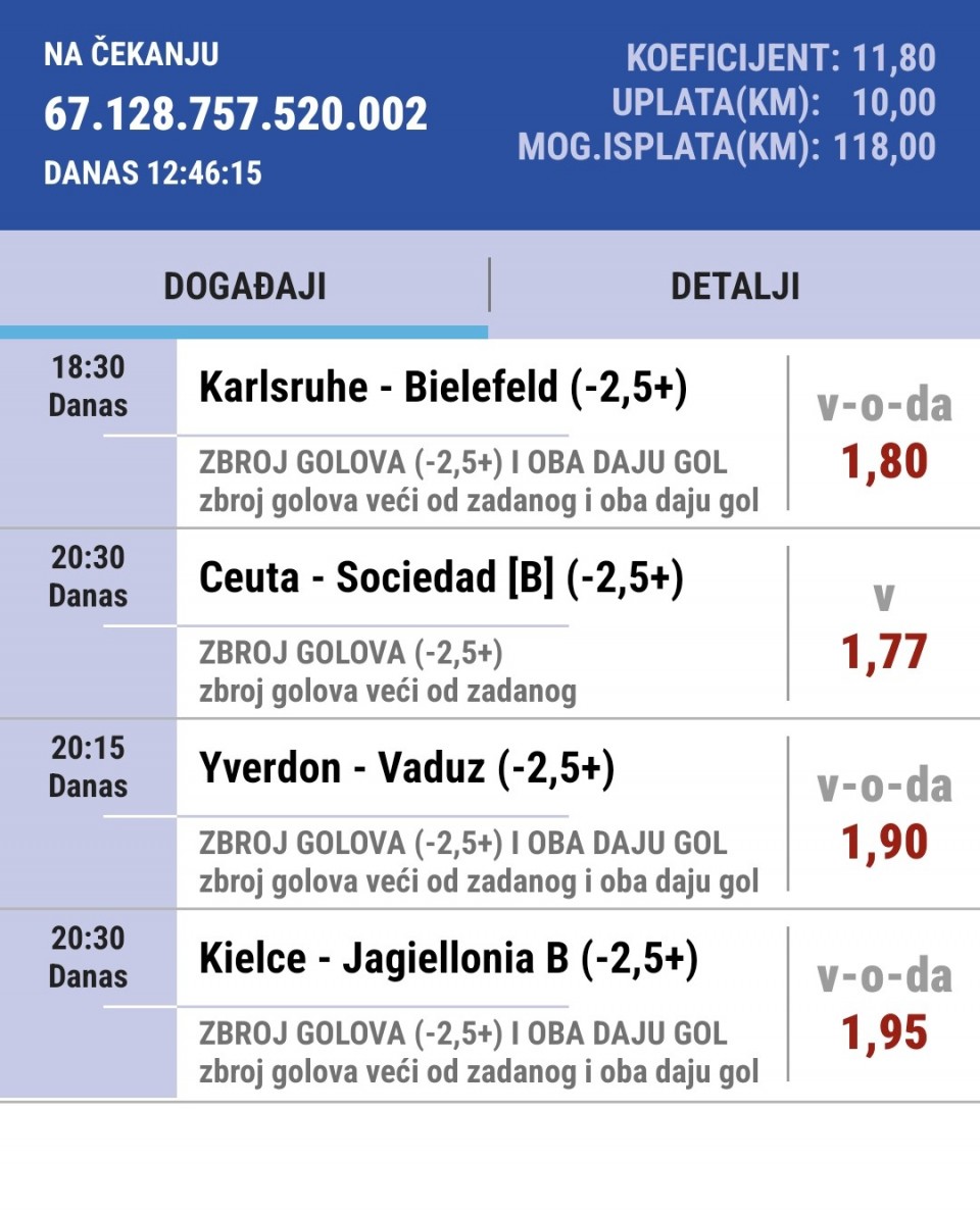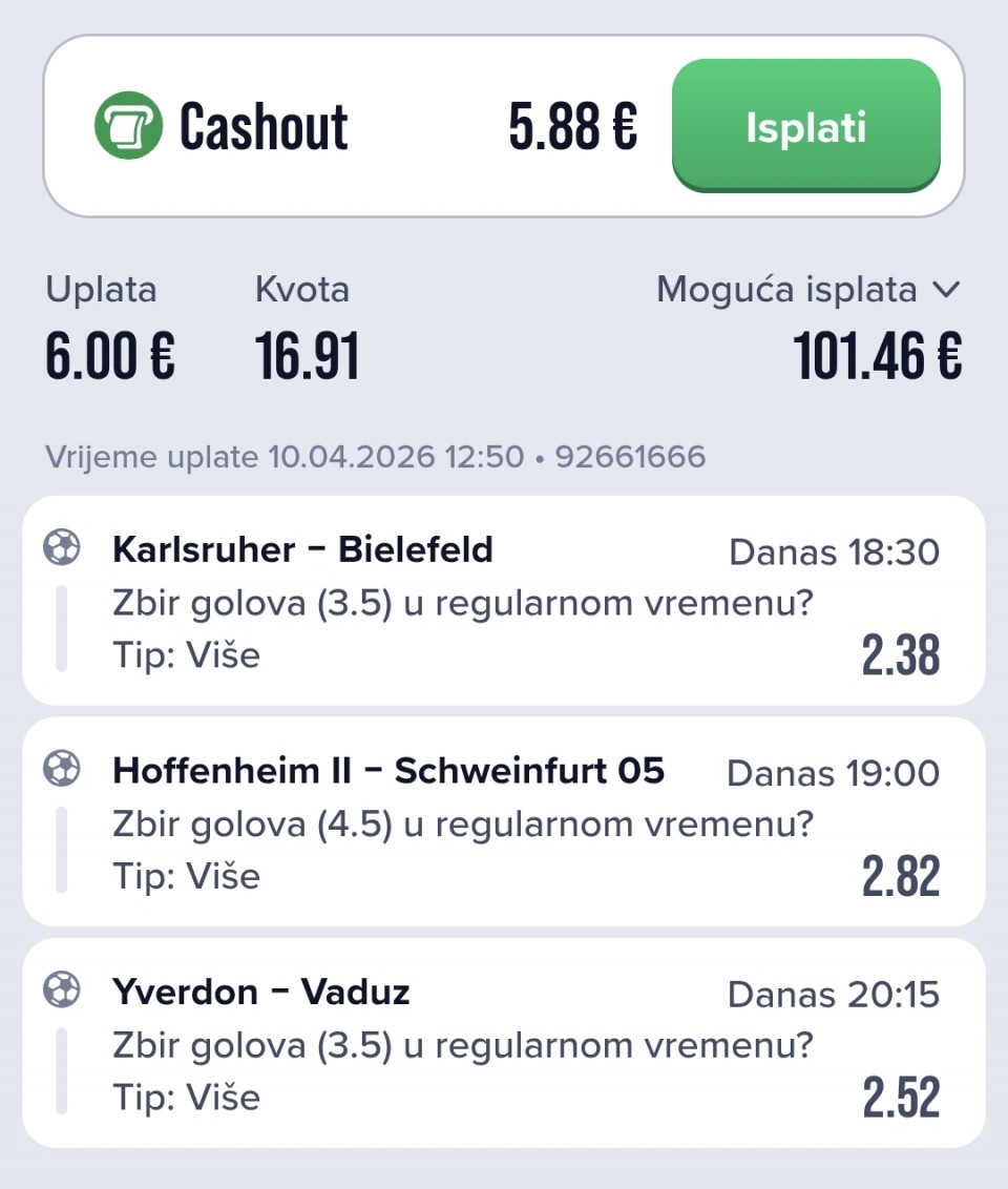 11.04.2026. 19:30h Monza - Bari;...11.04.2026. 15:00h Torino - Verona; tip: X; kvota: 3.35; uplata: 1.440,00 din.; isplata: 4.824,00 din.