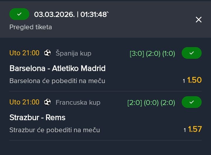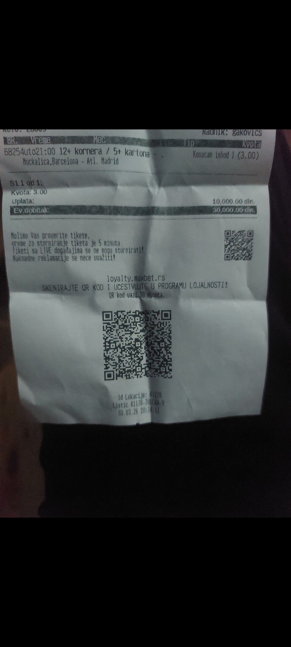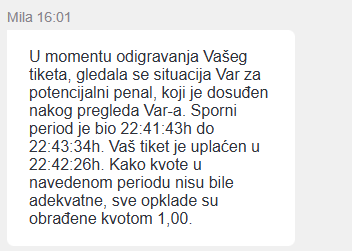 Sporna utakmica je Sosijedad i Bilbao, uplatio da pada gol, minut posle ide var i penal, tiket sve uredno uplacen i oni ovo napisu.. Uplata je 500 dinara dobitak 1250, ne planiram da vodim bitke sa njima, ali cisto da znate da je ovo najgora...Sporna utakmica je Sosijedad i Bilbao, uplatio da pada gol, minut posle ide var i penal, tiket sve uredno uplacen i oni ovo napisu.. Uplata je 500 dinara dobitak 1250, ne planiram da vodim bitke sa njima, ali cisto da znate da je ovo najgora kladionica. Prvi put igram, trebalo im je da me verifikuju par dana, mnogo losih iskustva, ali nikad vise. Show more