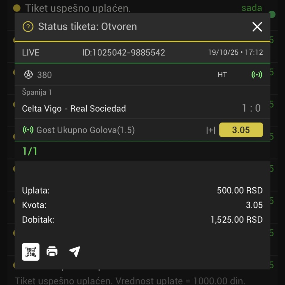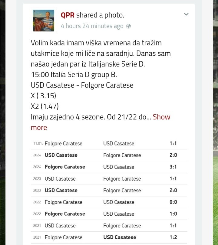 Ako neko zeli da proba. U pitanju je liga Tercera. Grupa 18. Pocinju u 17h. Ima ih Meridianbet. Nije neka kvota. Oko 1.67. Ako pogledamo kako su isle pobede. Red je da dodje dvojka. Ja cu igrati i prelaz jer znaju da naprave kada su ovakve...Ako neko zeli da proba. U pitanju je liga Tercera. Grupa 18. Pocinju u 17h. Ima ih Meridianbet. Nije neka kvota. Oko 1.67. Ako pogledamo kako su isle pobede. Red je da dodje dvojka. Ja cu igrati i prelaz jer znaju da naprave kada su ovakve situacije. Bez zaletanja jer su bile samo dve sezone. Show more