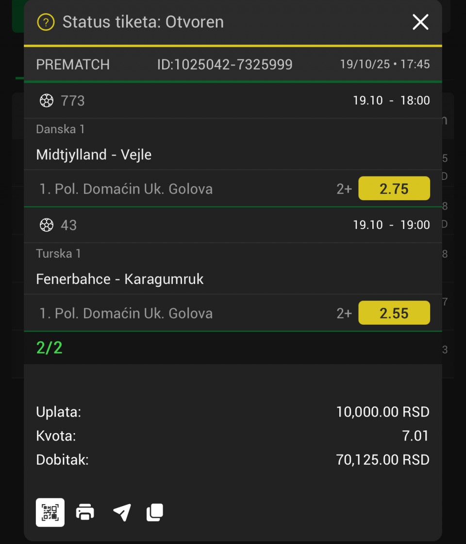 U poslednja 3 dana prematch singlovi 10/11, na kraju samo Groningen za gol, nadam se da je neko ispratio i čestitam ako jeste, za sutra samo jedan singl iz Danske i to je to, pozdrav💪