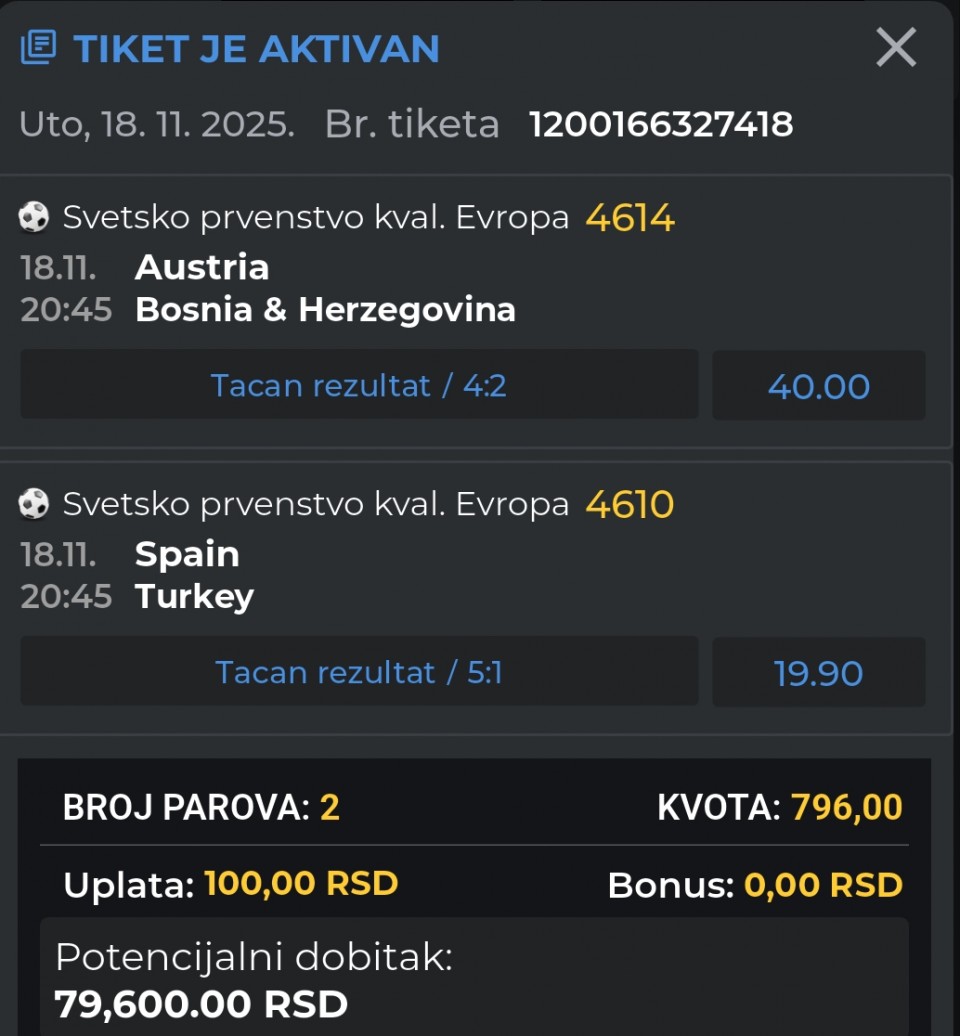 Sve je odlučeno u ovoj grupi, Španija je izborila prolaz na SP2026 i prošlu utakmicu izdominirala nad Turskom, nisu primili gol u 5 utakmica i gol razlika im je 19:0, ali svakako mislim da Turska sa dobrim napadackim potencijalom može doći do gola ovdje.