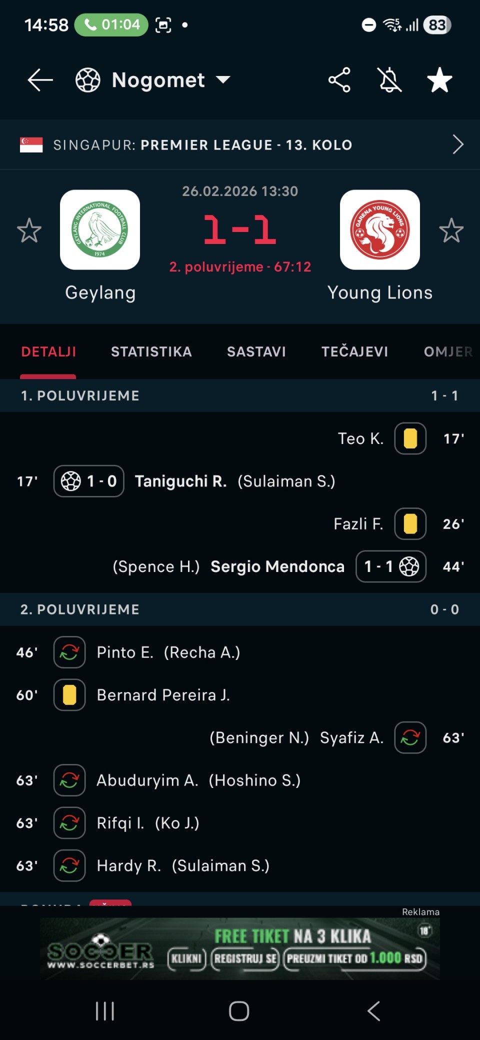 🇸🇬 13:30 Geylang - Young Lions 4+ (1.70)/ 5+ (2.35) Mozzart 7+ (6.75) MaxBet