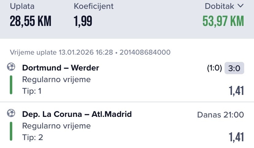 Dortmund je iza Bayerna 11 bodova i ako ne žele da se ta prednost poveća moraju ići na pobjedu kod kuće protiv Werdera. Dortmund kod kuće igra dobro ove sezone, imaju omjer 5-2-0 i gol razliku 13:4. Golove su dobili jedino...Dortmund - Werder H1 -1,5 2,00