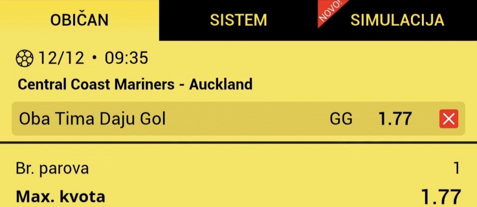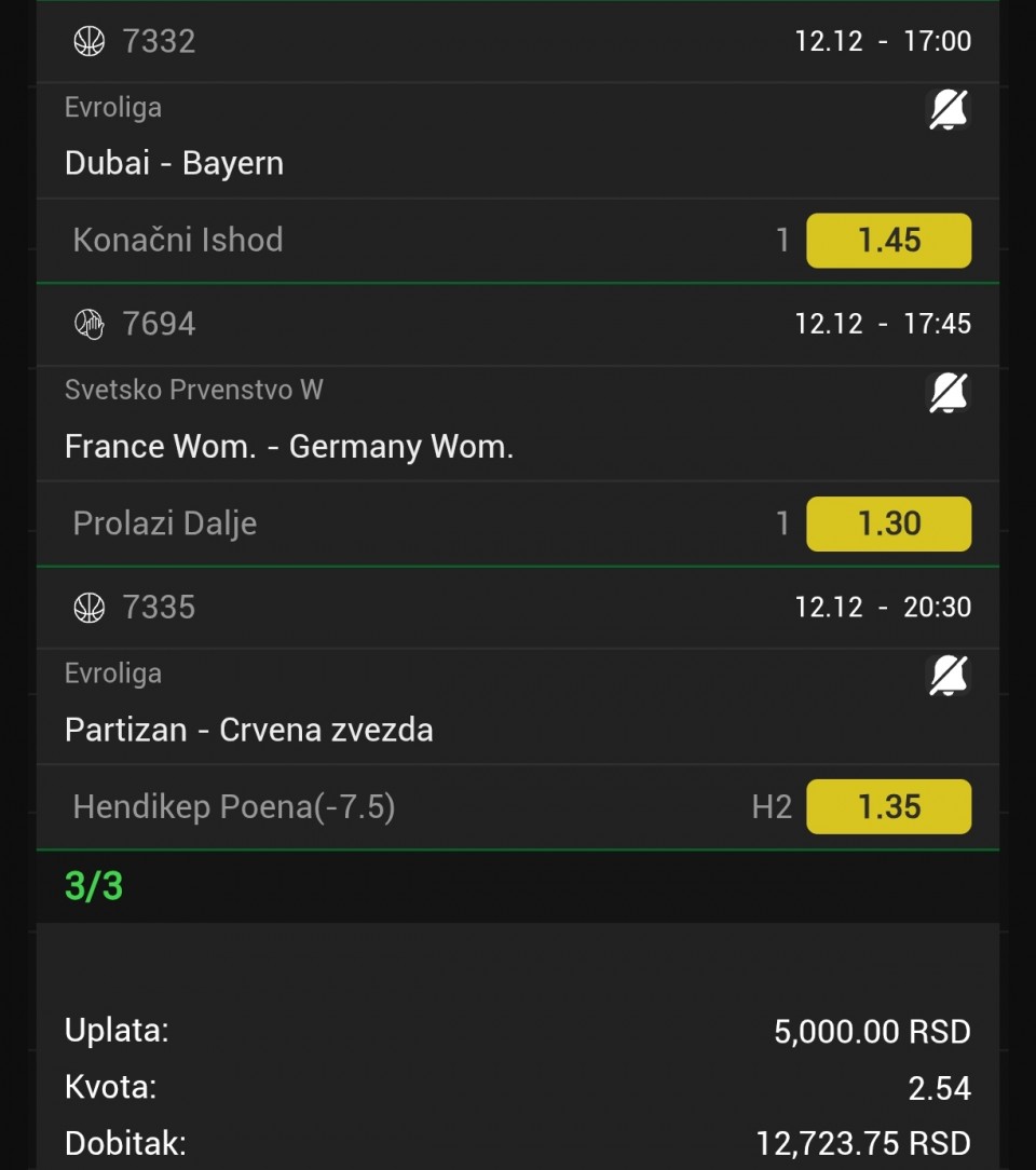 13.12.2025. 21:00h Dep. La Coruna - Real...12.12.2025. 20:00h Den Bosch - Venlo; tip: X; kvota: 3.65; uplata: 5.760,00 din.; isplata: 21.024,00 din.