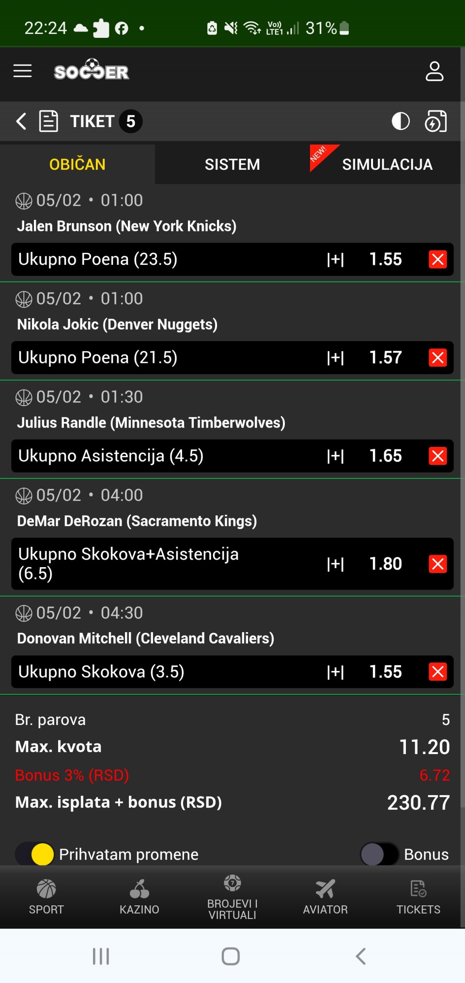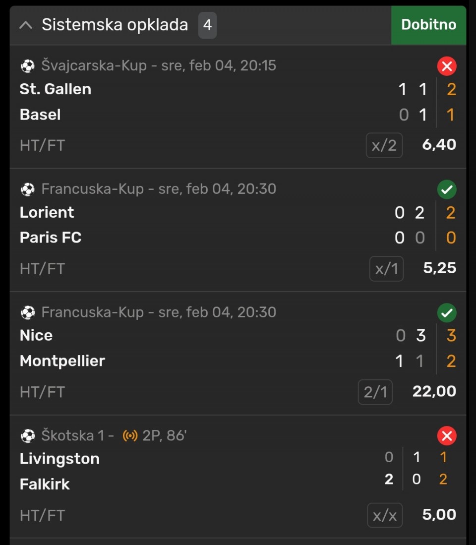 Igran je sistem 2,3,4/4 i prolaz steta sto nije bar 3/4 ali nema veze...