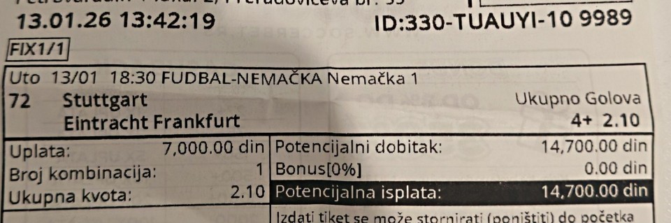 Štutgartu, nakon što je postigao 4 gola Leverkuzenu, ostaje da prenese tu formu na domaći teren gde na dve uzastopne utakmice nije postigao gol. To bi trebalo da se prekine protiv Frankfurta pošto postiže min 2 gola na 5/6 utakmica protiv Frankfurta na ovom terenu, a pritom je dobio i poslednjih 6 utakmica odigranih utorkom. Ali opet s druge strane, Frankfurt voli da igra protiv Štutgarta pošto je izgubio samo dve utakmice na prethodnih 13 odigranih i ima samo jedan poraz na poslednjih 6 gostovanja u ligi. A pošto oba tima ulaze u ovaj duel nakon 5+/6+ utakmica za vikend, više nego rado ću ih odigrati i ovog puta, pogotovo što se igra na terenu Štugarta jer se 5/6 H2H utakmica na ovom terenu zavšilo sa minimum 4 gola - nešto što stvarno ne mogu da ignorišem. 3/4 utakmice Štugarta na svom terenu dolazi čak 5+, a na samo dve utakmice Frankfurta u gostima čitave sezone u Nemačkoj nije postignuto bar 4 gola. Naravno najviše očekujem da goleadi doprinese Undav, koji u poslednja 3 meseca otkad se oporavio od povrede učestvuje maltene na svakoj utakmici postignutim gol(ovima) ili asistencijama...