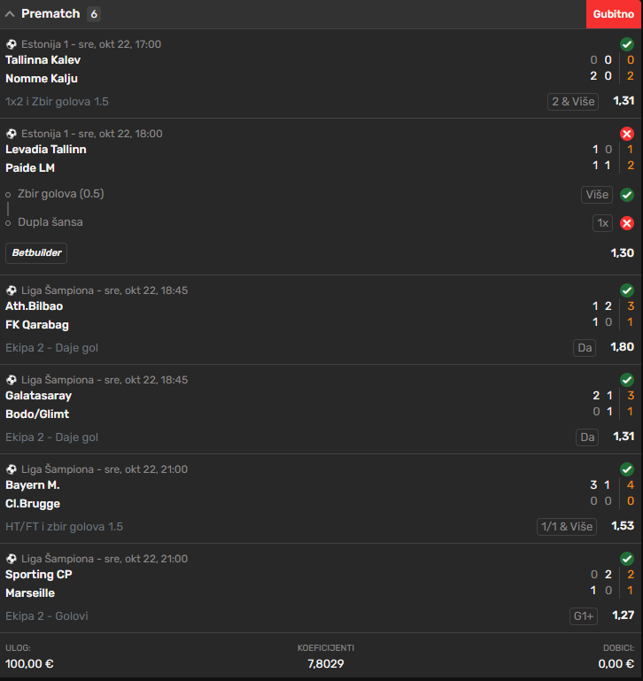Tesko je ostati ravnodusan na ovakav tiket za 850e. Trener Levadie drzi najbolje igrace na klupi do 70-80 minuta a u igri su za titulu Estonije. Nekad mi neke stvari stvarno nisu jasne.