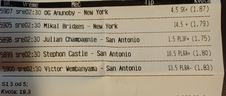 Mnogo dakle...Kao sto sam najavio stize i NBA a mnogo granica se promenilo u odnosu na tiket koji sam ja stigao da odigram jutros videcete vec i dobiti obrazlozenja, takodje zelim samo da dam veliki pozdrav za Tomsona veceras, zacepio je nekom usta