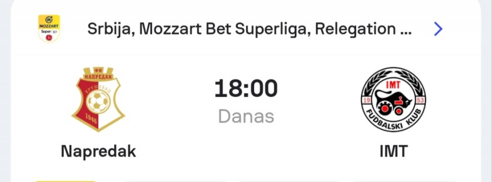 Nasoj ligi nista ne verujem,a kvota je dosta pala na Imt. Bila je oko 1.95 a sad jedva 1.40. Medjusobnih prelaza je bilo tri. dva u ligi za Imt,i jedan u kupu za Napredak. Srecno ko prati.