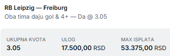Lajpcig igra dosta ofanzivnije i otvorenije na svom terenu - od 8 utakmica ove sezone pola ih se završilo ovim tipom. Frajburg u Nemačkoj ima 4/10 na gostovanjima i 1/3 u Evropi, tako da ni to nije loše. Ipak ono što je baš dobro su i njihovi H2H susreti - 3/4 su se završavali ovim tipom kao i poslednja 3 susreta na ovom terenu. Ni jedan ni drugi tim ne igraju defanzivno i vrlo verovatno će oba tima ići na pobedu - Lajpcig ohrabren sigurnošću igranja na domaćem terenu gde je samo Bajern postigao više golova i željan prekida niza od dva poraza (obe utakmice GG4+), i Frajburg ohrabren formom pošto je u tih pomenutih 7 utakmica izgubio samo jednom a pobedio 5 puta...