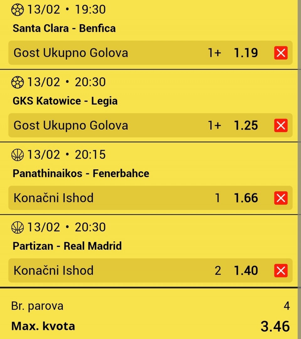 Ozbiljna forma , poceo ja da pogadja trice . Jeste da fener ima dosta pucaca i kvalitetnih igraca ali forma i poslednji medjusobni dao im 15 tako da se nadamo prolazu.
